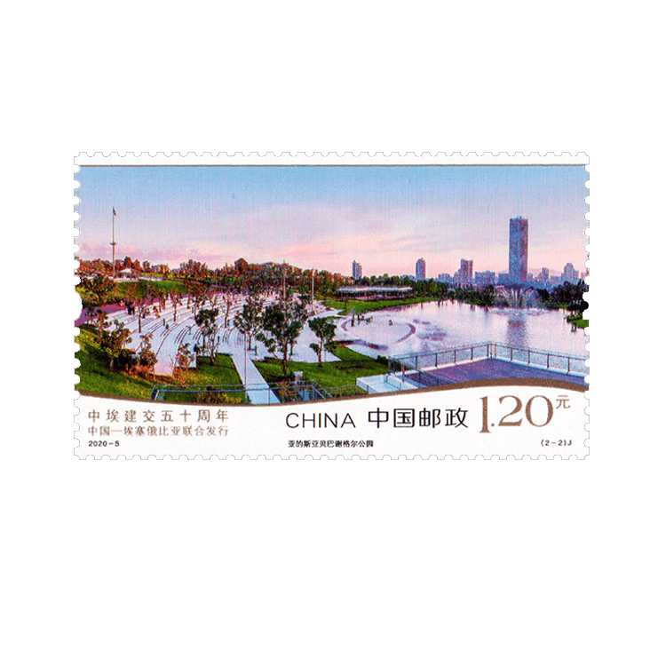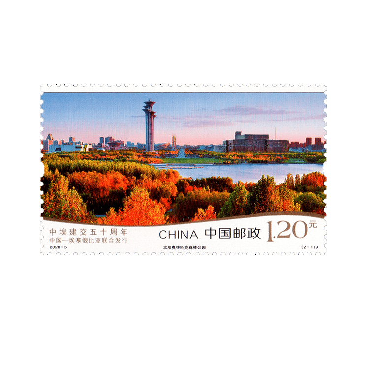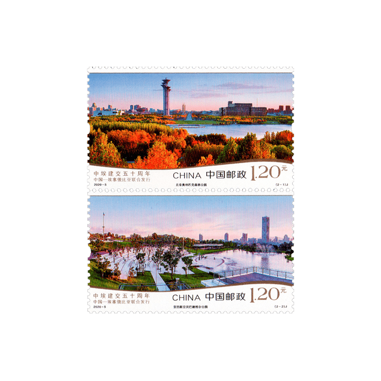 为纪念中华人民共和国与埃塞俄比亚联邦民主共和国建交50周年,中国邮政定于2020年11月24日发行《中埃建交五十周年》纪念邮票一套2枚(与埃塞俄比亚联合发行)。图案名称分别为:北京奥林匹克森林公园、亚的斯亚贝巴谢格尔公园,全套邮票面值为2.40元,计划发行数量为720万套。