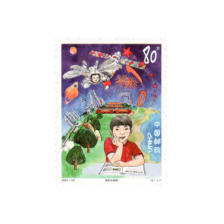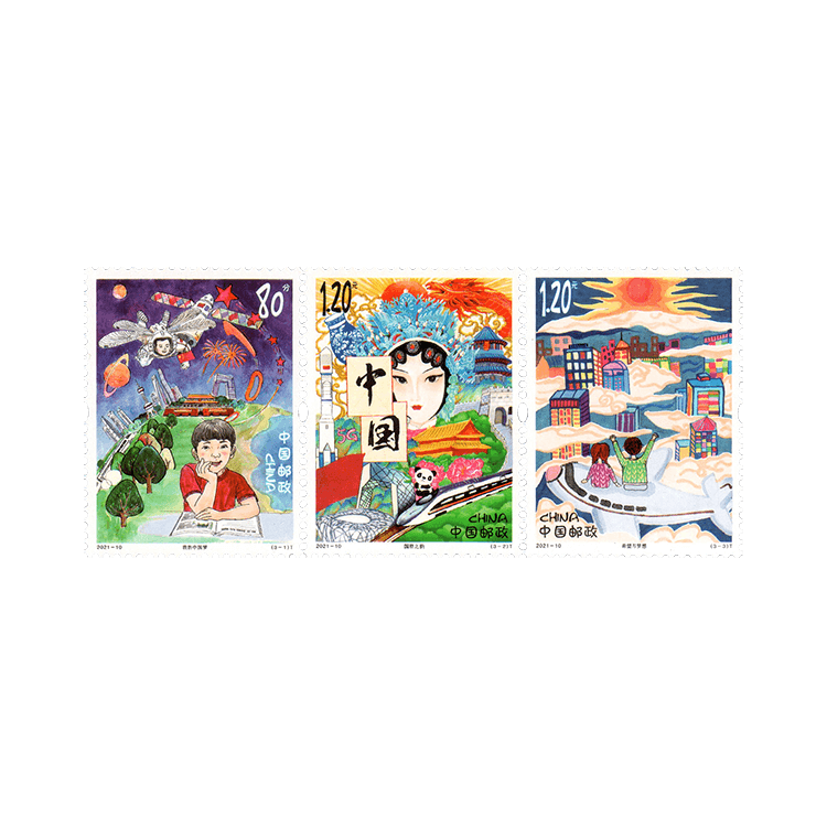 该套邮票的表现内容为:(1)我的中国梦;(2)国粹之韵;(3)希望与梦想。第一枚通过描绘我国航空航天事业、城市、交通网络繁荣发展等场景,表达了少年儿童不断追寻对宇宙探索的梦想以及对未来美好生活的想象与憧憬;第二枚描绘了传统文化与城市发展、现代科技共繁荣的场景,表达了新时代的少年儿童对中华优秀传统文化的追求和传承;第三枚描绘了伟大祖国不断发展的场景,少年儿童登高望远、憧憬未来。三枚邮票紧密围绕主题,展现出少年儿童对党的领导下伟大祖国的美好祝愿、热爱和自豪。