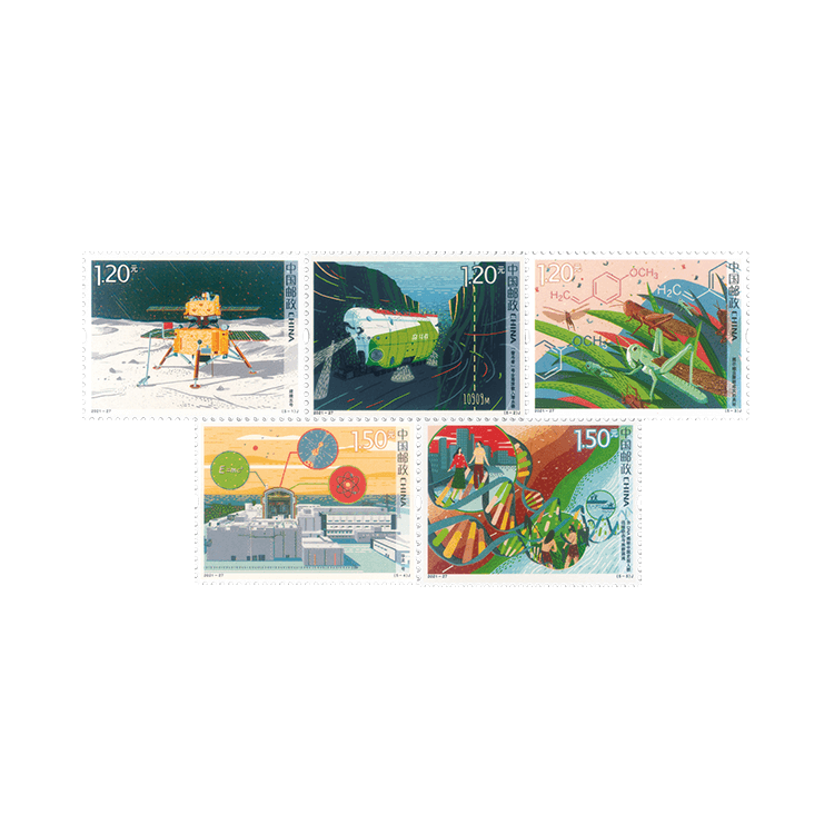 该套邮票由杜钰凯设计,画面延续前两组的系列特点,采用现代手绘插画方式表现,色彩鲜亮明快,画面清新自然。图一主要表现了“嫦娥五号”月球探测器首次实施无人月面取样的工作场景,为中国探月工程三期的收官之战;图二展现的“奋斗者”号全海深载人潜水器是我国首台具备全球海域载人进入能力的重要装备,也是当前全球同类型载人潜水器中载员人数最多、海底作业时间最长、作业能力最强的装备;图三“揭示蝗虫聚群成灾的奥秘”通过蝗虫聚集、4VA化学式等场景画面,表现了化合物4-乙烯基苯甲醚(4VA)是飞蝗群聚信息素这一昆虫学研究重大突破,该研究使蝗虫的绿色和可持续防控成为可能;图四以“华龙一号”为主画面,辅以能量公式、核裂变等元素符号,展现了我国具有完全自主知识产权的第三代压水堆核电创新成果,这一成果标志着我国核电技术水平和综合实力已跻身世界第一方阵;图五以古今对比、DNA链、古地层等为表现元素,形象展现了“古DNA揭秘中国史前人群迁徙动态与族群源流”的画面主题。该成果填补了东方尤其是中国地区史前人类遗传、演化、适应方面的重要信息。