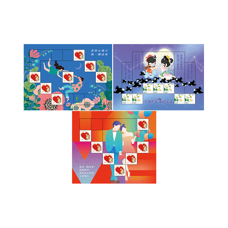 • “梦幻七夕”个性化邮票通用版--《牛郎织女 相思若来》、《爱是永恒》、《爱的“心”满天》