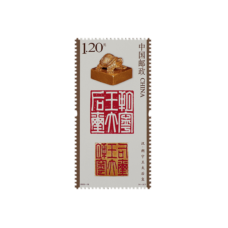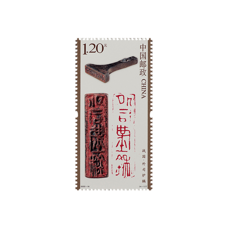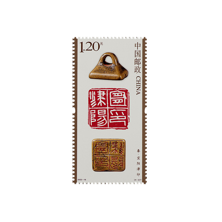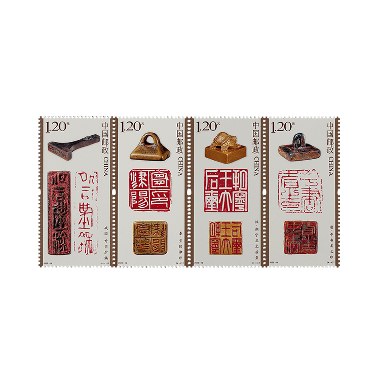 该套邮票由中国收藏家协会印章收藏与研究委员会会长、中国书法家协会理事、中国美术家协会理事、西泠印社理事容铁设计。邮票采用竖长票型,全方位展示了印章、印蜕、印面三部分,并采用古朴淡雅的宣纸色为背景,视觉层次立体,画面细节丰富,突出了中国篆刻艺术悠远浓厚的文化韵味。邮票第一图展现的“战国·外司炉鍴”,铜印,通高9.5厘米,为战国时期燕国官印,有观点认为是掌管铸造钱币的职官之官印,藏于北京故宫博物院;第二图展现的“秦·宜阳津印”,铜印,印面纵横各2.3厘米,是秦代管理宜阳县渡口官员的官印,藏于上海博物馆;第三图展现的“汉·朔宁王太后玺”,金印,边长2.4厘米,高2厘米,为西汉末年反对王莽的义军首领之一朔宁王为其母亲镌刻,藏于重庆中国三峡博物馆;第四图展现的“唐·中书省之印”,铜印,印面5.7×5.6厘米,通高3.9厘米,为唐代中央官署官印,藏于北京故宫博物院。