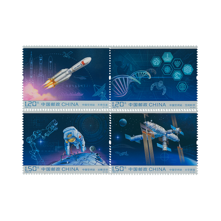 中国邮政定于2022年12月25日发行《中国空间站》纪念邮票一套4枚。邮票表现内容为:(1)天地往返;(2)空间科学;(3)出舱活动;(4)太空家园。全套邮票面值5.40元。邮票计划发行数量为套票800万套,版式二110万版。