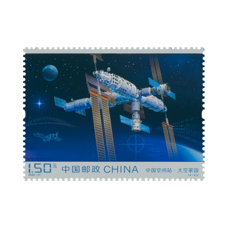 第4枚 太空家园。这枚邮票以环绕地球的中国空间站为主体,以强烈的视觉冲击力呈现了广袤无垠的宇宙空间,体现出建设航天强国、营造太空家园、探索未知宇宙的寓意,寄托着和平利用宇宙空间、开放共享造福人类的美好愿望。