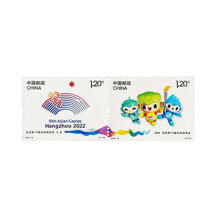 中国邮政定于2023年9月23日发行《杭州第19届亚洲运动会》纪念邮票一套2枚,邮票图案名称为会徽、吉祥物。全套邮票面值2.40元。邮票计划发行数量为783万套,版式二 88.5 万版。