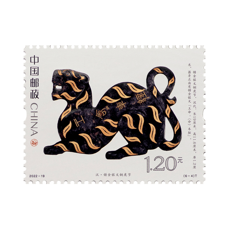 中国邮政定于2022年9月5日发行《虎(文物)》特种邮票一套6枚。邮票图案名称分别为:商·伏鸟双尾青铜虎、春秋·青玉虎形佩、汉·白虎瓦当、汉·错金铭文铜虎节、金·磁州窑白釉褐花卧虎枕、清·皮影飞虎。全套邮票面值为7.20元。