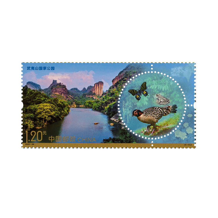 武夷山国家公园总面积1280平方公里,横跨福建、江西两省,是中亚热带森林生态系统典型代表、东南动植物宝库、世界文化和自然双遗产地,被中外生物学家誉为“天然植物园”“鸟的天堂”“蛇的王国”“昆虫的世界”“研究亚洲两栖爬行动物的钥匙”。邮票表现了福建假稠李、千里光、黄腹角雉、武夷林蛙、金斑喙凤蝶等元素。