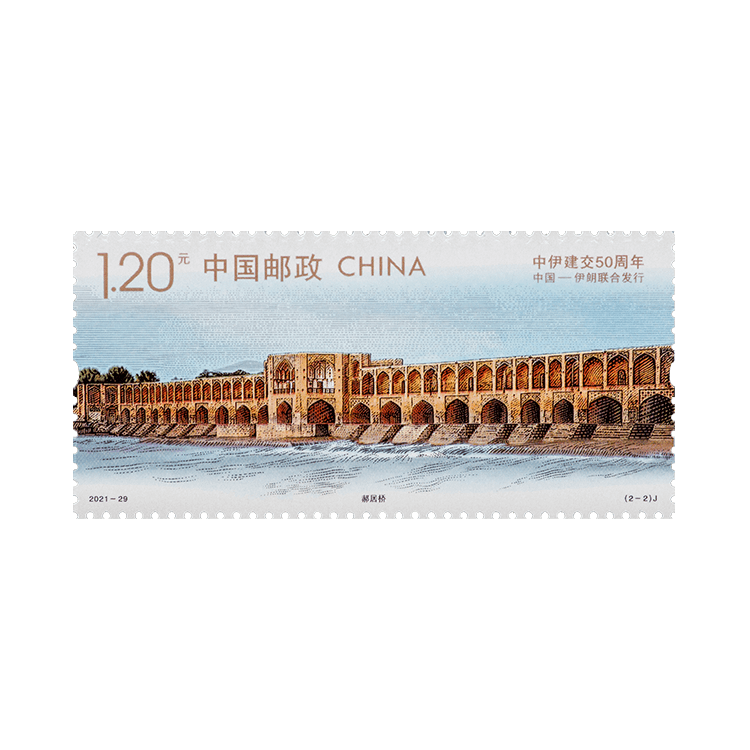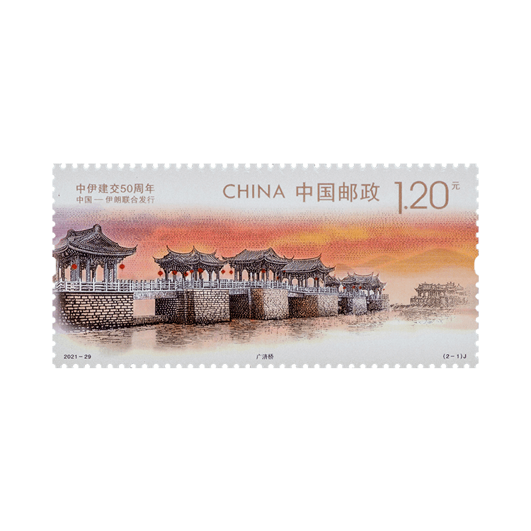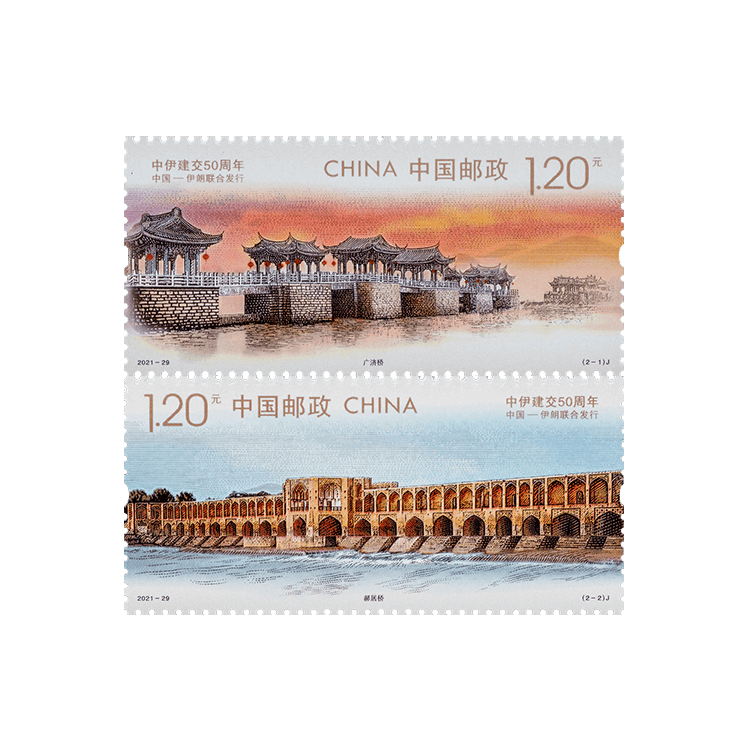 2021年是中华人民共和国与伊朗伊斯兰共和国建交50周年,为增进中伊两国人民之间的相互了解和友谊,中国邮政定于2021年12月11日发行《中伊建交50周年》纪念邮票1套2枚(与伊朗联合发行),邮票图案名称分别为:广济桥、郝居桥,全套邮票面值为2.40元,邮票计划发行数量680万套。