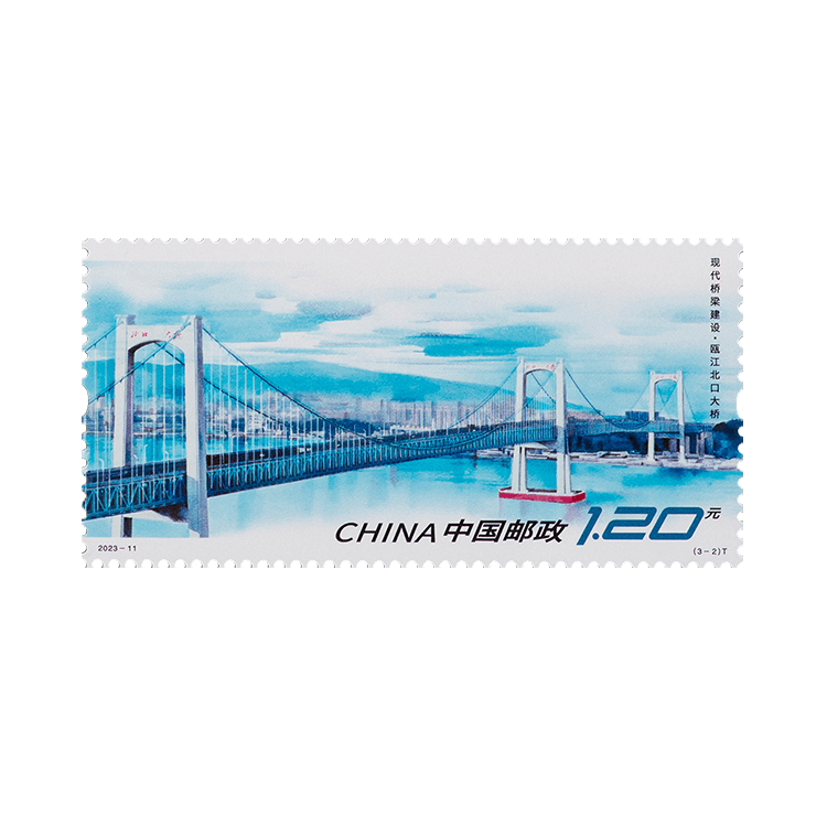 中国邮政定于2023年6月30日发行《现代桥梁建设》特种邮票1套3枚、小型张1枚,邮票图案名称为沪苏通长江公铁大桥、瓯江北口大桥、平南三桥,小型张图案名称为北盘江第一桥。全套邮票面值9.60元。邮票计划发行数量为735万套,小型张计划发行数量585万枚。