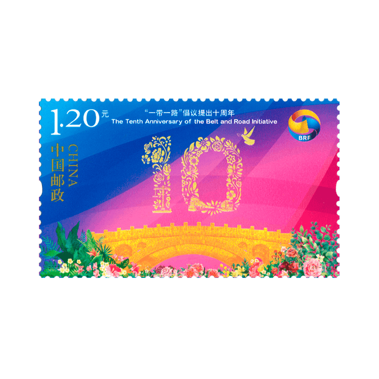 中国邮政定于2023年9月7日发行《“一带一路”倡议提出十周年》纪念邮票一套1枚,邮票图案名称为“一带一路”倡议提出十周年。全套邮票面值1.20元。