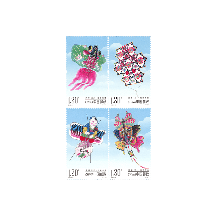 风筝集艺术、文化、科技、体育竞技于一身,制作精美,文化内涵深厚,因地理位置不同,各地风筝的文化内涵也不同。图一“金玉满堂”,属硬翅风筝,为山东风筝的代表作之一,其融合了民间绘制手法,由金鱼、荷花图案组合而成,寓意金玉满堂、富贵吉祥。图二“瑞狮如意”,属硬板子风筝,为江苏南派风筝的代表作之一,其由瑞狮、八宝如意图案组合而成,并装置了由葫芦、毛竹、白果、龙眼制作的若干大小不一的哨口,保留古代风筝“弦响碧空”的特点,升空后哨声和谐悦耳,寓意吉祥繁荣、生生不息。图三“仙鹤童子”,属硬翅风筝,为山东风筝的代表作之一,其展现童子手持栗色灵芝骑于仙鹤背上、仙鹤口衔两枚仙桃展翅飞翔的图案,寓意吉祥安康。图四“葫芦万代”,属组合软翅风筝,为天津风筝的代表作之一,其可折叠、组装,便于携带,其图案中几只蝴蝶围绕花丛,并点缀以葫芦元素,寓意多子多孙、幸福绵长。本套邮票全面表现了风筝这一历史悠久的民间艺术珍品,表达出放飞风筝就是放飞理想、放飞希望的美好寓意。该套邮票由沈嘉宏设计,北京邮票厂采用影写版工艺印制。