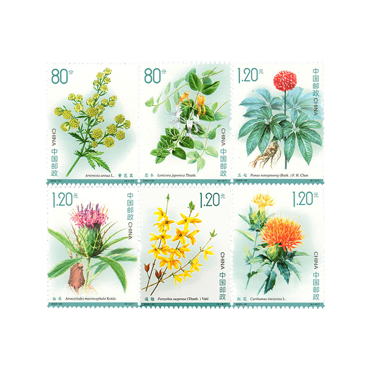 中国邮政定于2023年10月11日发行《药用植物(三)》特种邮票一套6枚,邮票图案名称为黄花蒿、忍冬、三七、白术、连翘和红花。全套邮票面值6.40元。