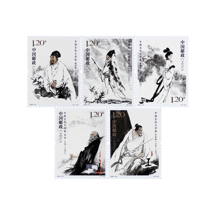 中国邮政定于2023年11月8日发行《中国古代文学家(五)》纪念邮票一套5枚,邮票图案名称为欧阳修、苏轼、李清照、陆游、辛弃疾。全套邮票面值6.00元。