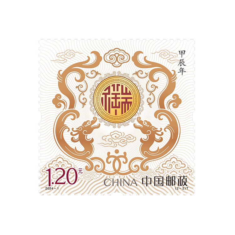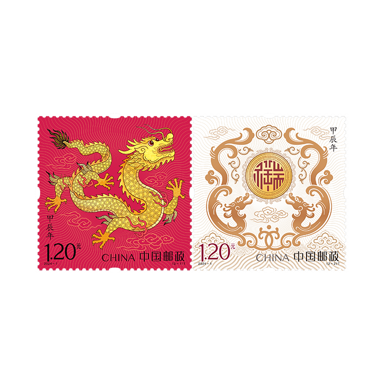 在十二生肖中,龙是神兽,象征尊贵和力量,在民间寓意吉祥好运。邮票一套两枚,图案汲取中国历代经典龙形象中的文化基因,结合生肖文化特征和邮票艺术特点,用平面装饰的设计语言诠释出新的时代、新的历史时期的龙形象,彰显出新时代自信、自强的文化底蕴,画面简洁明快,色彩喜庆吉祥,寓意祥瑞美好。邮票一图名为“天龙行健”,展现了一条昂首奋发的金龙,象征蓬勃向上、自强不息的精神风貌。其形象和姿态源自故宫九龙壁,灵动宛转而不失敦厚威严。金龙身旁饰以寓意吉祥的火焰和祥云纹样并衬以中国红背景,展现出吉庆祥和、纳福迎祥的美好图景;二图名为“辰龙献瑞”,邮票图案源于中国传统吉祥纹样“祥龙拱璧”。画面整体与邮票外形构成“天圆地方”的格局,和谐而庄重。中央玉璧有“祥瑞”二字合文,寓意祥和圆满、福瑞安康。上方的如意纹样传递出和顺致祥之意,下方的水纹、云纹与龙形象共同展现了龙腾四海的宏阔景象,表达出风调雨顺、国泰民安的美好愿望。两枚邮票主打红、金、黑经典三色,体现出了大气、贵气、瑞气和喜气,一动一静、相得益彰。该套邮票由王虎鸣设计,北京邮票厂有限公司采用胶雕套印工艺印制。