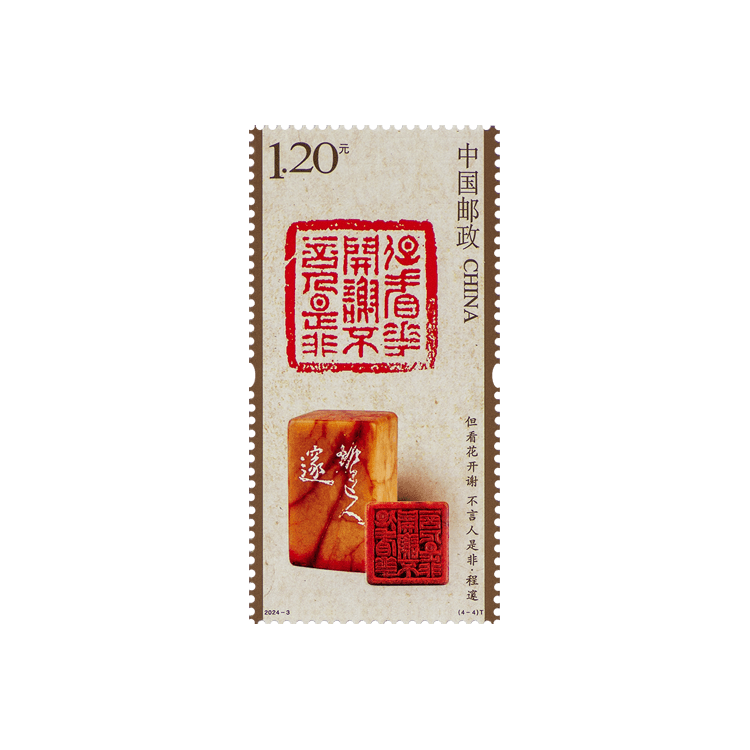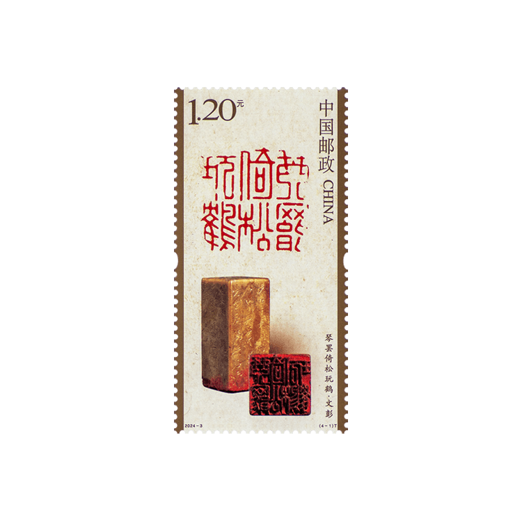中国邮政定于2024年3月20日发行《中国篆刻(二)》特种邮票1套4枚,邮票图案名称分别为:琴罢倚松玩鹤・文彭;笑谈间气吐霓虹・何震;子孙非我有 委蜕而已矣・汪关;但看花开谢 不言人是非・程邃。全套邮票面值4.80元。邮票计划发行数量为套票698万套,版式二90万版。