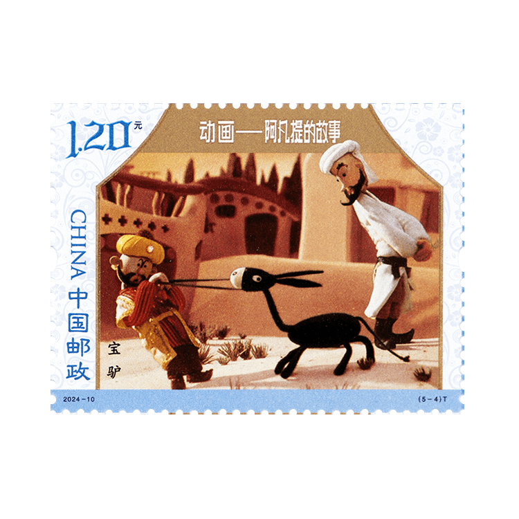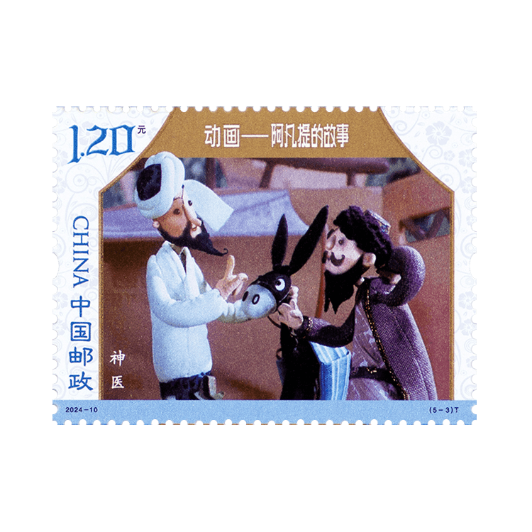 中国邮政定于2024年6月1日发行《动画——阿凡提的故事》特种邮票1套5枚,邮票图案名称为卖树荫、兔送信、神医、宝驴、种金子。