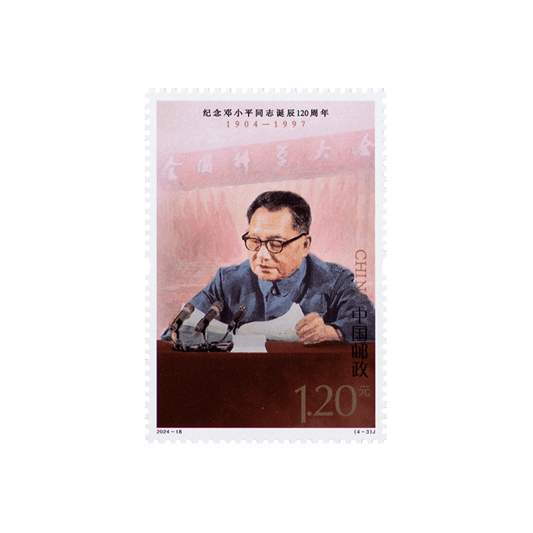 邓小平同志是全党全军全国各族人民公认的享有崇高威望的卓越领导人,伟大的马克思主义者,伟大的无产阶级革命家、政治家、军事家、外交家,久经考验的共产主义战士,中国社会主义改革开放和现代化建设的总设计师,中国特色社会主义道路的开创者,邓小平理论的主要创立者。邮票第一图“勤工俭学”,邓小平同志16岁远渡重洋勤工俭学,并在那里接受了马克思主义,加入中国共产党,从此矢志不渝为党和人民事业奋斗了70多年;第二图“戎马岁月”,抗日战争和解放战争期间,邓小平同志坚决执行党中央和毛泽东同志的战略决策,军政兼任、勇挑重担,不畏艰险、出奇制胜,一直处在战略全局的关键位置,处在对敌斗争的最前线;第三图“科学春天”,1978年,党中央召开全国科学大会,邓小平同志在大会上作出科学技术是生产力的重要论断,我国迎来“科学的春天”;第四图“改革开放”,党的十一届三中全会以后,邓小平同志始终站在时代要求、国家发展、人民期待的高度,同中央领导集体一起,领导我们党作出一系列重大决策,把改革开放和社会主义现代化建设一步一步推向前进。
