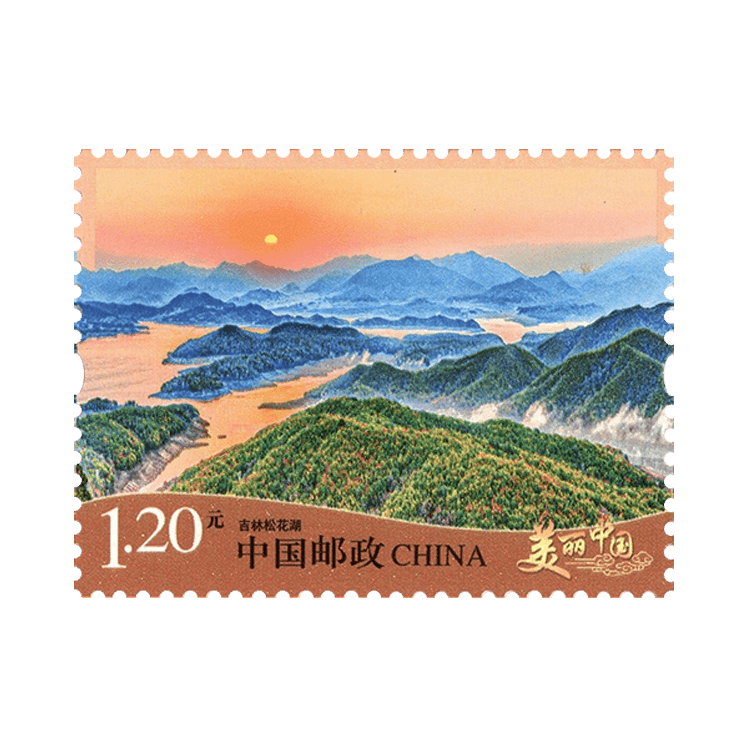 第二枚“吉林松花湖”位于吉林市的东南部,是吉林省最大的人工湖泊。松花湖以得天独厚的地理位置,四季分明的气候条件,湖光秀丽的特殊景色著称。松花湖是1937年筑坝拦截松花江水,建设丰满水电站后所形成的。这里与长白山一脉相连,山水相依,层次丰富,可以概括为“水旷、山幽、林秀、雪佳”。松花湖水域辽阔,湖汊繁多,状如蛟龙,湖形狭长,从空中俯瞰,松花湖像一串闪光的珍珠,素有“北国明珠”的美誉。