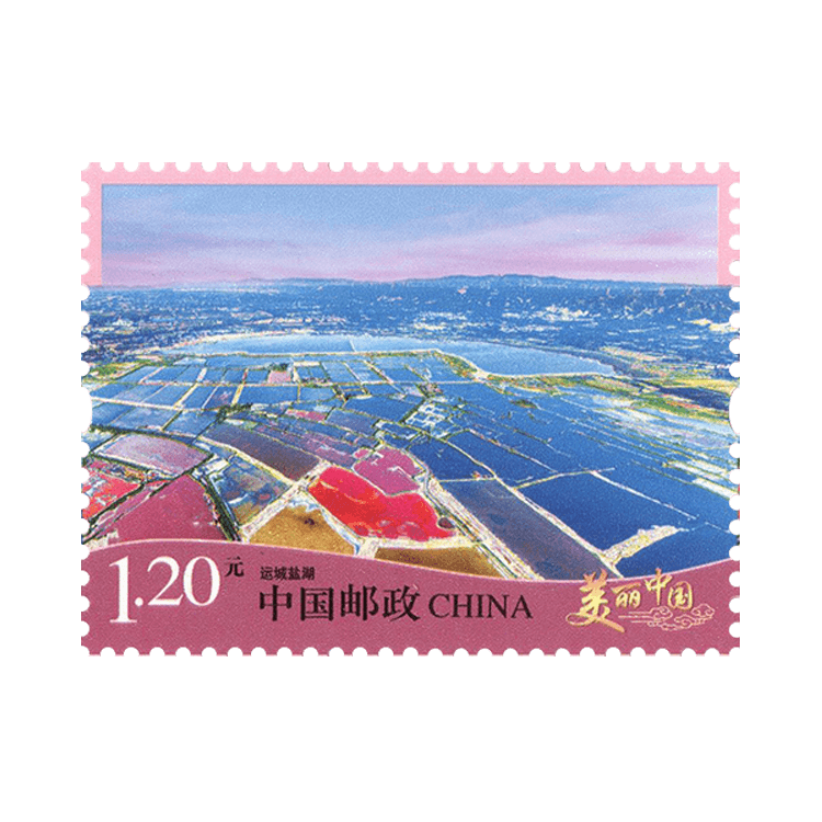 第三枚“运城盐湖”,运城盐湖总面积达132平方公里,是世界三大硫酸钠型内陆盐湖之一,也是山西省面积最大的湖泊。向西与黄河古渡相接壤,往南与苍劲俊秀的中条山相毗邻,北依峨嵋岭,东接涑水瑶台,水深六米,形似天然浴盆。运城盐湖为我国古代发现的唯一一处天然结晶池盐宝藏。由于山出海走,大量含盐类的矿物质汇集在这里,经过长期的沉淀蒸发,形成了天然的盐湖。夏季或初秋季节的盐湖,随着气温逐渐升高,盐湖水质不断变换色彩,盐湖呈现出一幅色彩斑斓的画卷,从空中俯瞰,宛若巨型调色板,其高饱和度的色彩美若童话,令人陶醉。