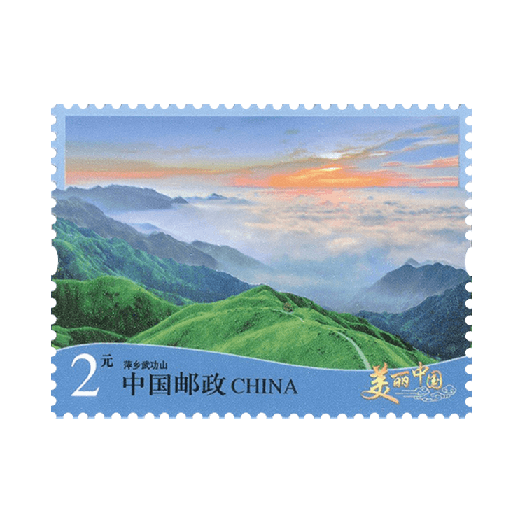 第四枚“萍乡武功山”,武功山位于江西省萍乡市东南部,居罗霄山脉北段,主峰白鹤峰海拔1918.3米,是江西境内最高峰。武功山是集人文景观和自然景观为一体的山岳型风景名胜区,以高山草甸、峰林地貌、飞瀑温泉、千年祭坛、优越生态为主要特点,其资源类型与特色被专家概括为“山景雄秀、瀑布独特、草甸奇观、生态优良、天象称奇、人文荟萃”。萍乡武功山景区具有世界上同纬度绝无仅有的十万亩高山草甸,绵延于高山之巅,穿云入雾,与巍峨山势相映成辉,晨光熹微中,云海沿着山顶的苍翠绿意奔腾万里,云雾翻涌,宛如惊涛骇浪一般。