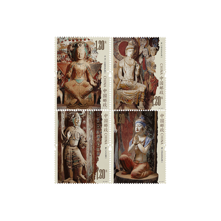 中国邮政定于2024年8月3日发行《莫高窟(二)》特种邮票1套4枚、小型张1枚,邮票图案名称为北凉弥勒菩萨像、唐胁侍菩萨像、唐天王像、唐供养菩萨像,小型张邮票图案名称为隋释迦佛一铺。全套邮票面值10.80元。邮票计划发行数量为620万套,小型张530万枚。