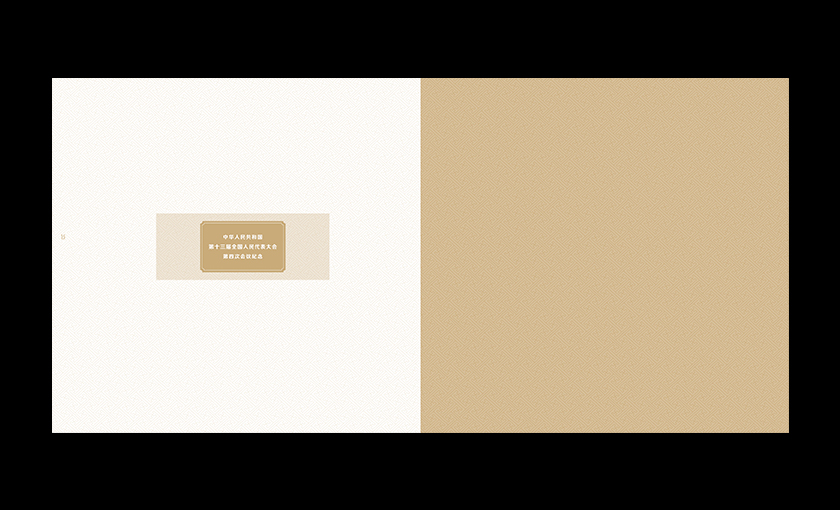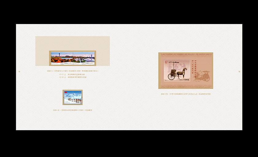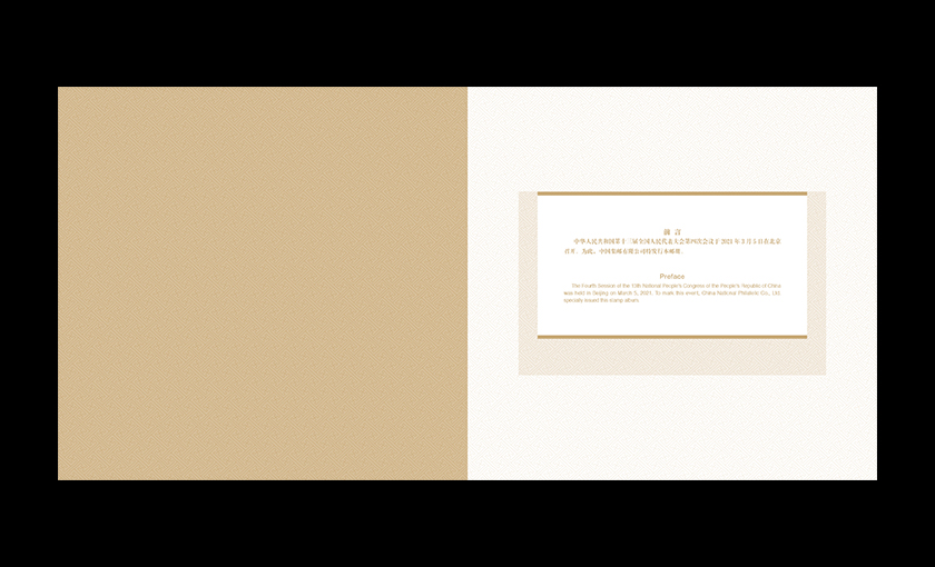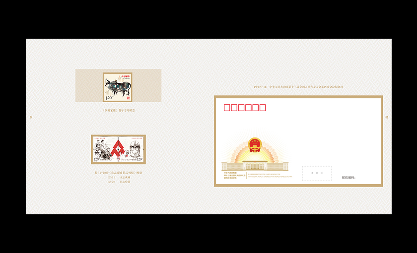 中华人民共和国第十三届全国人民代表大会第四次会议纪念邮册整体采用庄重大气的设计风格,封面、插套选用国徽、人民大会堂作为主要设计元素,并选用古典的绢色加以衬托,采用条纹递进的方式展现设计层次感,衬以中国红为背景色,既突出全国人民代表大会的庄重与肃穆,也体现出喜迎大会召开的热烈庆祝氛围。