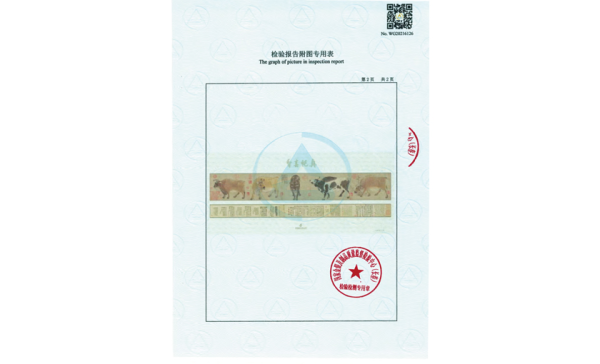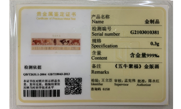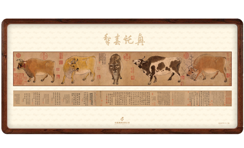 《五牛聚福》金版画由胡桃木框装裱,画框外形尺寸长70cm,宽33.8cm,边框厚2.2cm。浅米黄色底衬纸板印金色云纹、画芯宽63cm*高10cm,题跋宽63cm*、高4.3cm,原画金底色,产品画芯和题跋部分采用0.3克Au 99.99的原料金(成色标注为足金 999)进行制作,贵金属画面局部采用珐琅彩、线条凸版印刷、轮廓线劈花工艺。