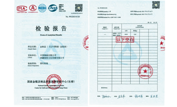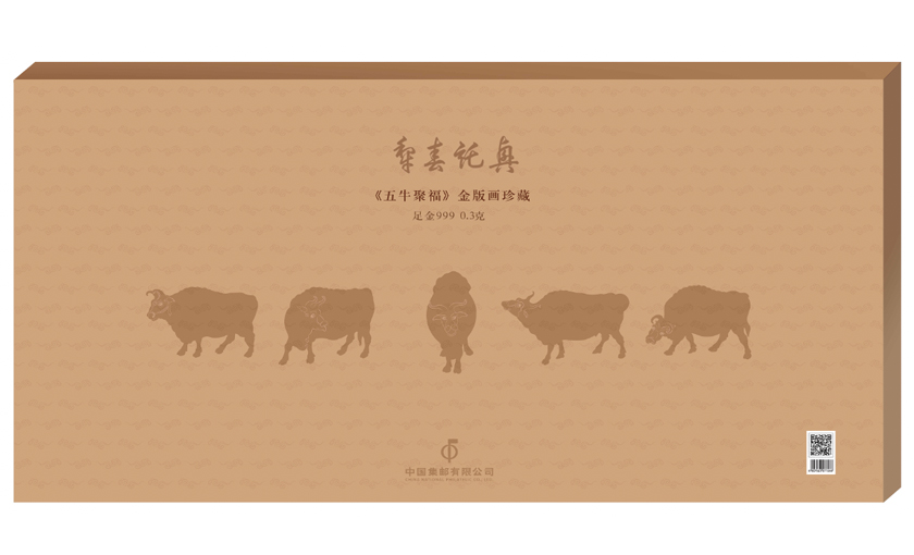 《五牛聚福》金版画产品是中国集邮有限公司为配合2021年《五牛图》特种邮票新邮而发行的贵金属产品,0.3g足金。产品配《五牛图》赏析册1本 (内含《五牛图》套票、小型张、版式一、首日封、小型张首日封、4枚个性化票)、国检证书1张。