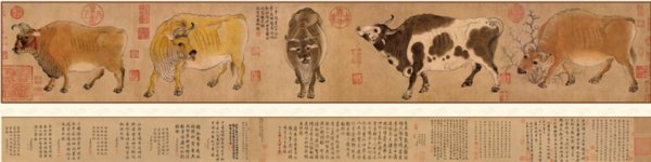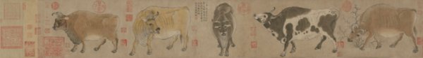 《五牛图》是少数几件唐代传世纸绢画作品真迹之一,也是现存最古的纸本中国画,堪称“镇国之宝”,收藏于北京故宫博物院。目前十大名画中藏于大陆且未发行邮票的,仅余此图。