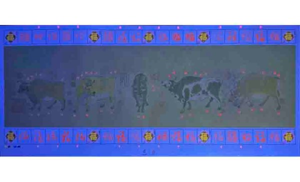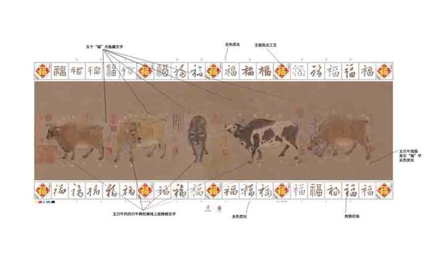 装饰画中五只牛引入微缩文字工艺,肉眼无法识别,需用放大镜方可观察,可以达到防伪鉴真的效果。