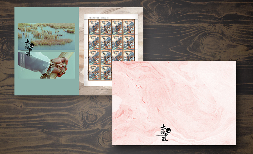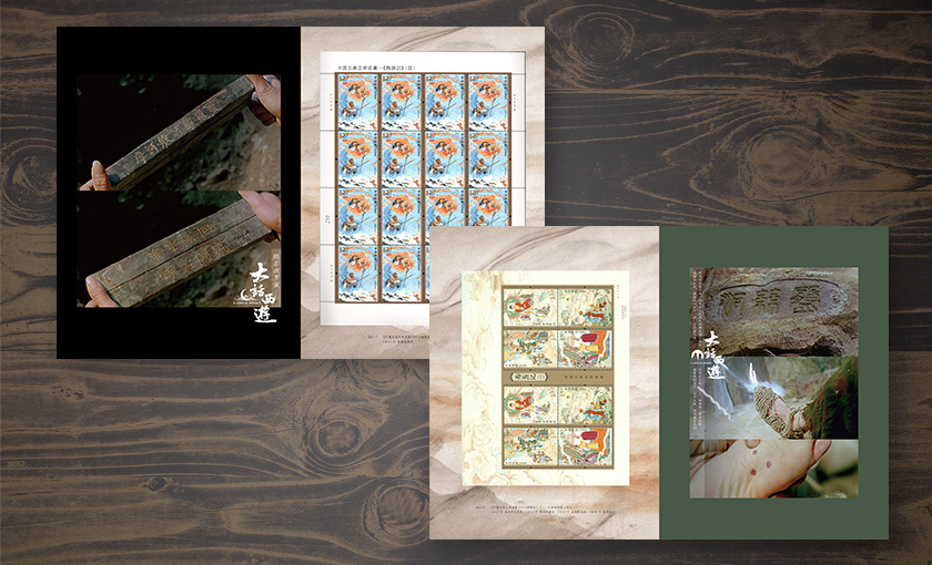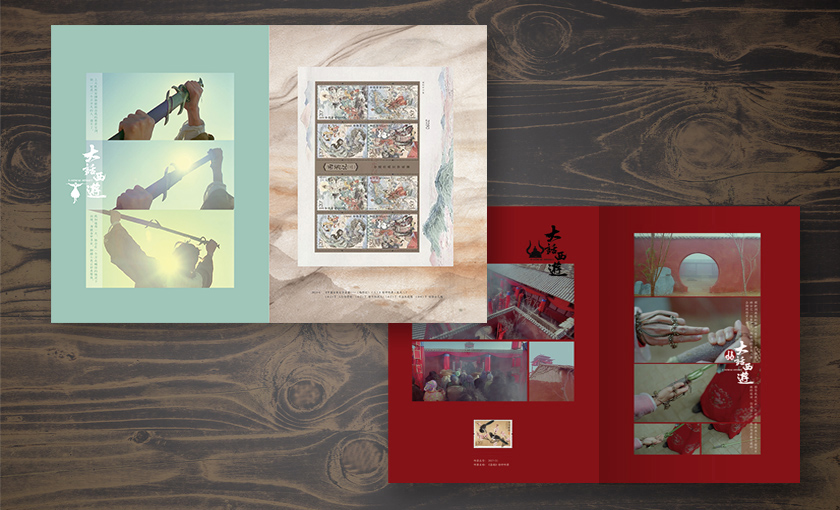 邮册含有《大话西游》主题个性化邮票,紧箍咒元素配合太阳神鸟主图的邮票致敬《大话西游》2017年珍藏版海报设计,邮票中央男女主角的剪影若隐若现,仿佛置身大漠,身临其境。