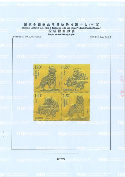 产品使用浮雕微刻、冷压起鼓、镜面磨砂、全息幻彩等贵金属工艺,产品四周及中间打有贯通正反面的邮票齿孔,在小克重(2克)、大面积(72*72mm)超薄金片上,立体展现了《壬寅年》邮票图案。