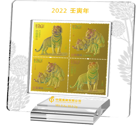 为恭贺2022壬寅新年,中国集邮有限公司延续新春传统发行生肖题材产品《壬寅年》邮票金,编号YPJ-9。