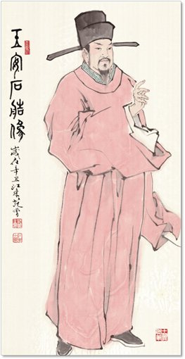 诗解:北宋杰出政治家、大诗文家,名列唐宋八大家。 神宗时为丞相。其文章如《游褒禅山记》,为激励后之 来者,发愤图强的千秋妙文。与苏东坡为莫逆,王安 石晚年隐居江宁,东坡造访,戏曰:“今日敢以微服见 大丞相”,王安石笑答:“礼岂为吾辈设”,相携吟唱, 传为士林佳话。