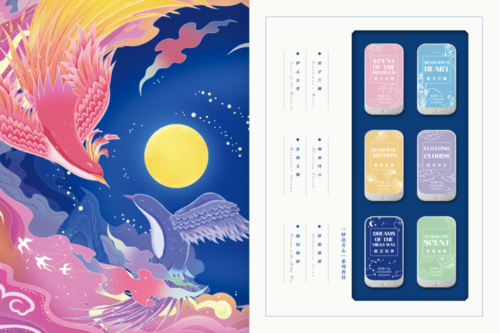 册内还嵌有6款不同香味的涂抹式香膏,我们根据每款香膏的调性及邮册中诗词特点撷取灵感,用邮票集藏的独特方式,将最浪漫的语言力量和最独特的香味气息融为一体。