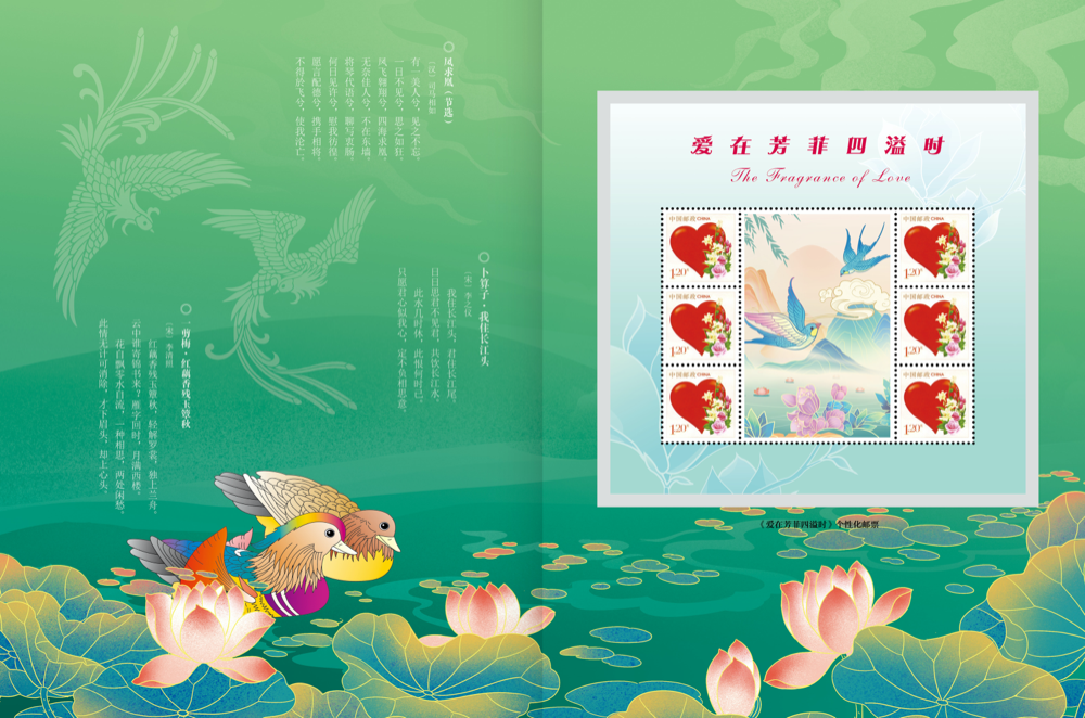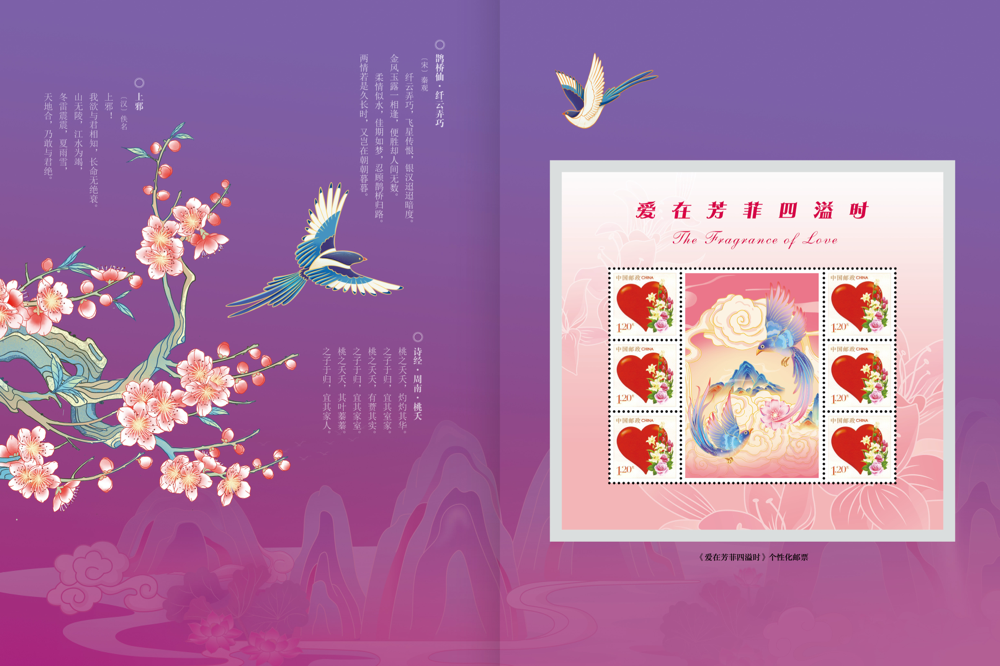 邮册收录了与“爱情 ”相关的精美主题邮票,将浓浓的爱意收藏在方寸之间。精选六首表达爱意的古诗词,用现代人的视角去品味穿越千年的相思意。
