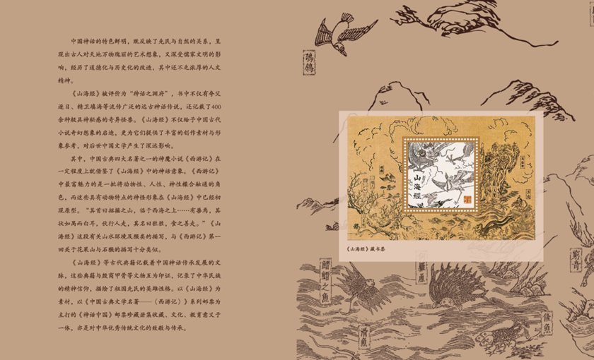 《神话中国》邮票珍藏册以国家图书馆藏《山海经》古籍的珍贵高清图绘和书影为素材,配以《中国古典文学名著——<西游记>(五)》小型张、版式二,《八十七神仙卷(局部)》套票和《中国古代神话(二)》套票,产品还包含限量版《山海经》藏书票、可以保存500年的《山海经》缩微胶片典藏卡与《山海经》系列金属徽章1枚。搭配线上展示功能,您通过手机即可近距离欣赏国家图书馆馆藏三个版本的《山海经》古籍原貌,见证中华文明之弦歌不辍、文脉之延绵不绝,感受中华优秀传统文化的深厚底蕴。