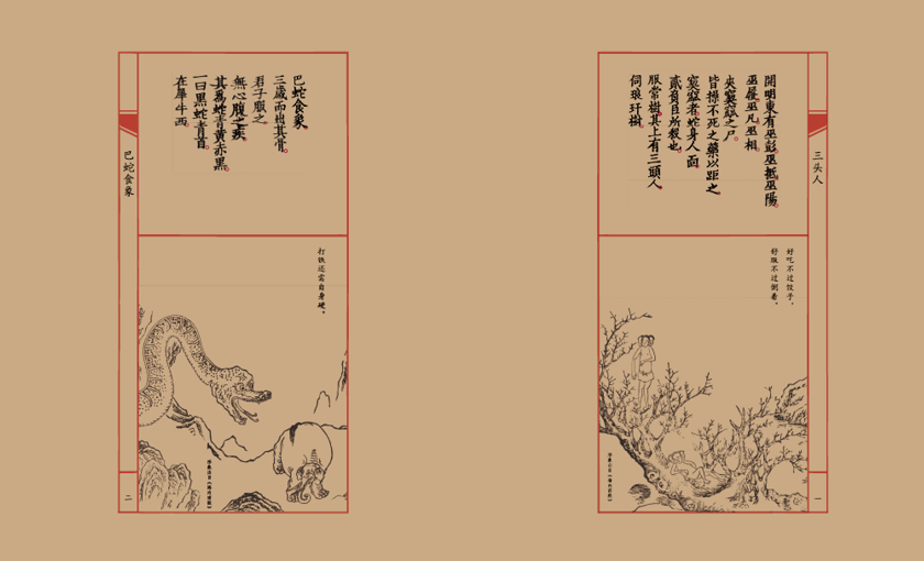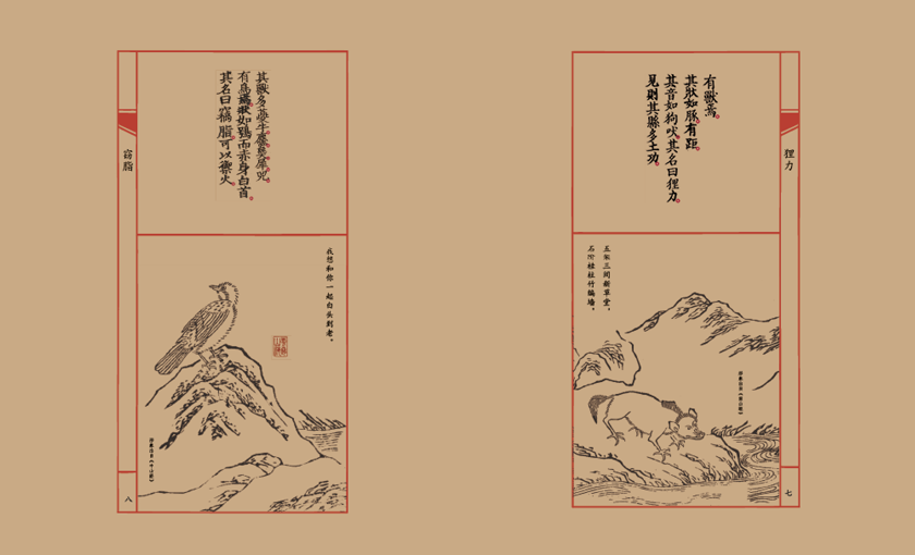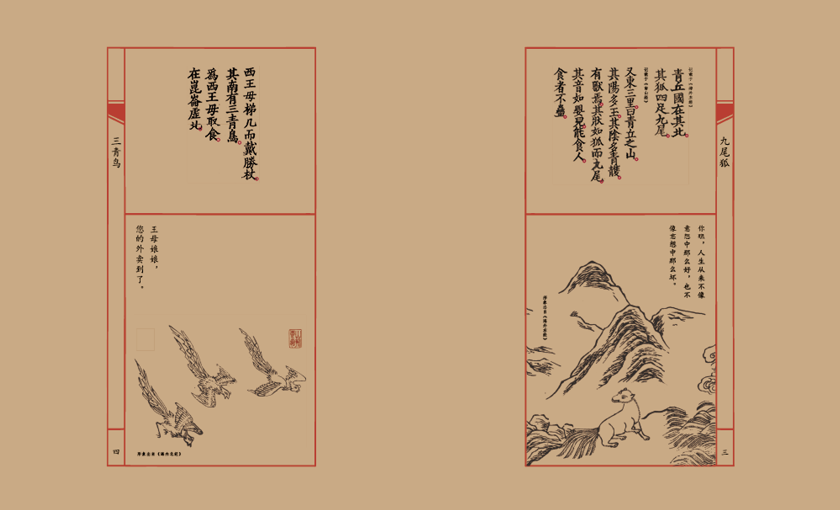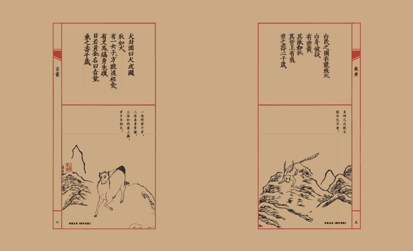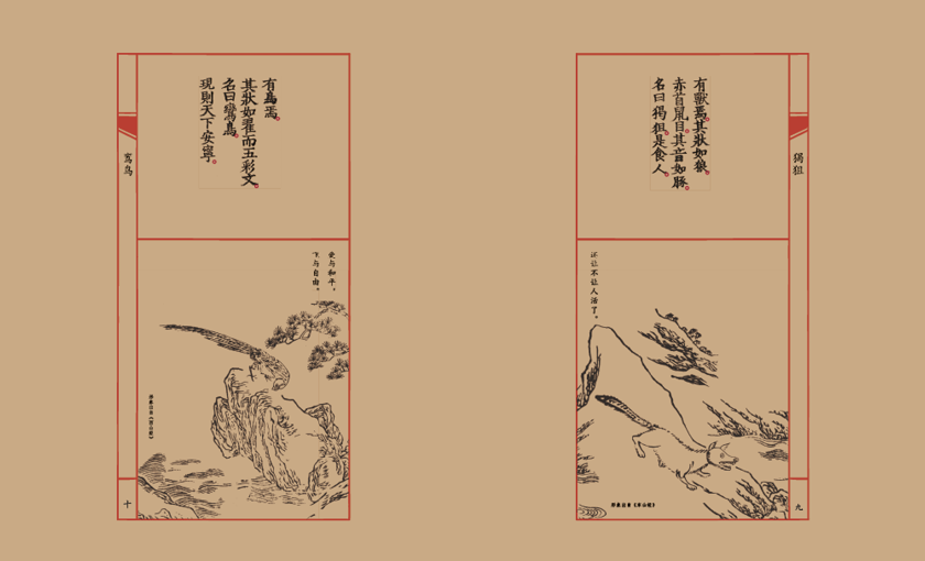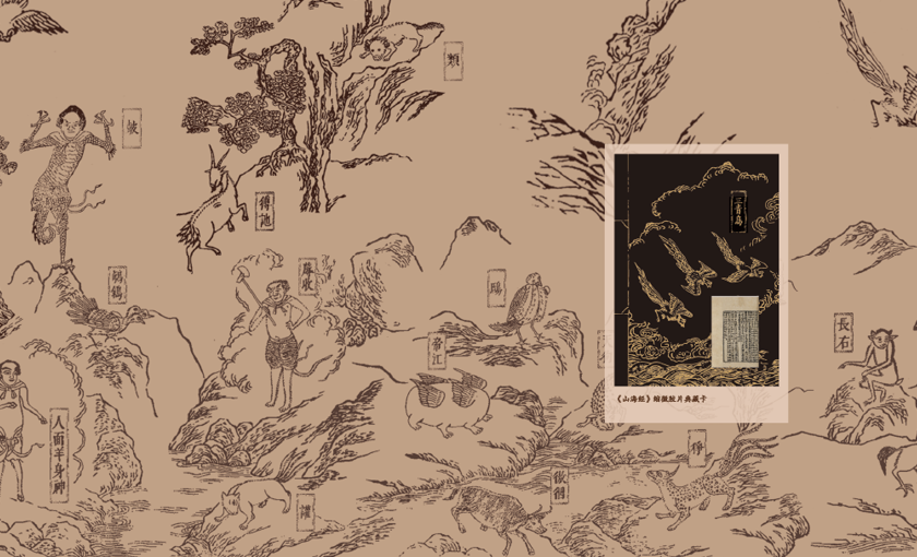珍藏册背景图绘设计灵感来源于国家图书馆藏《山海经》珍贵古籍书影,古画均取自明刻蒋应镐绘《山海经十八卷》,整体设计简约古朴,采用中国传统的经折装装订方式,沉淀着中国典籍文化的厚重和端雅。