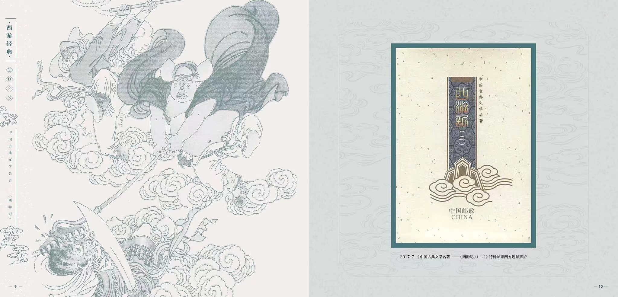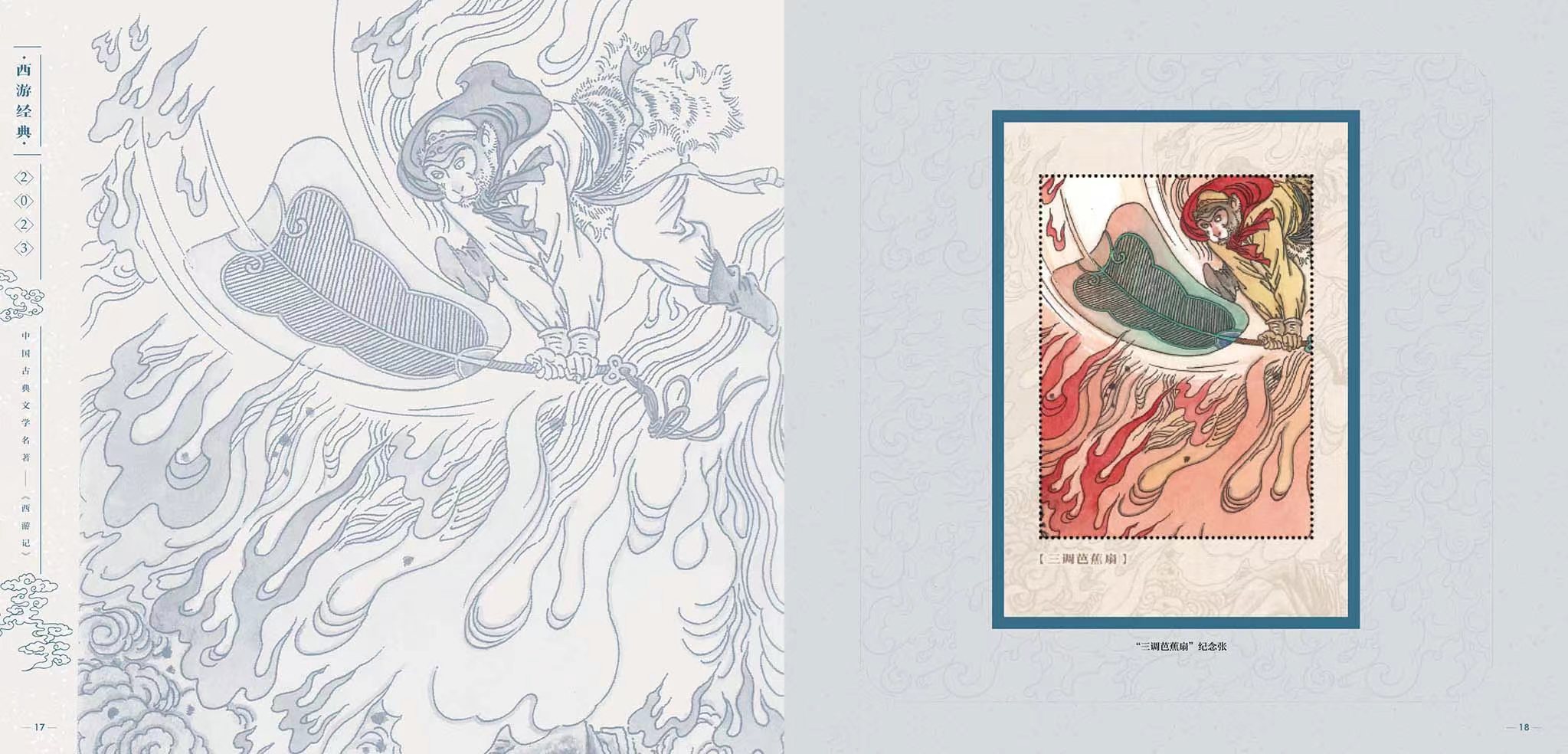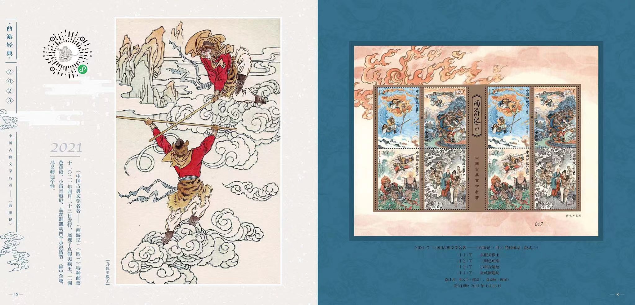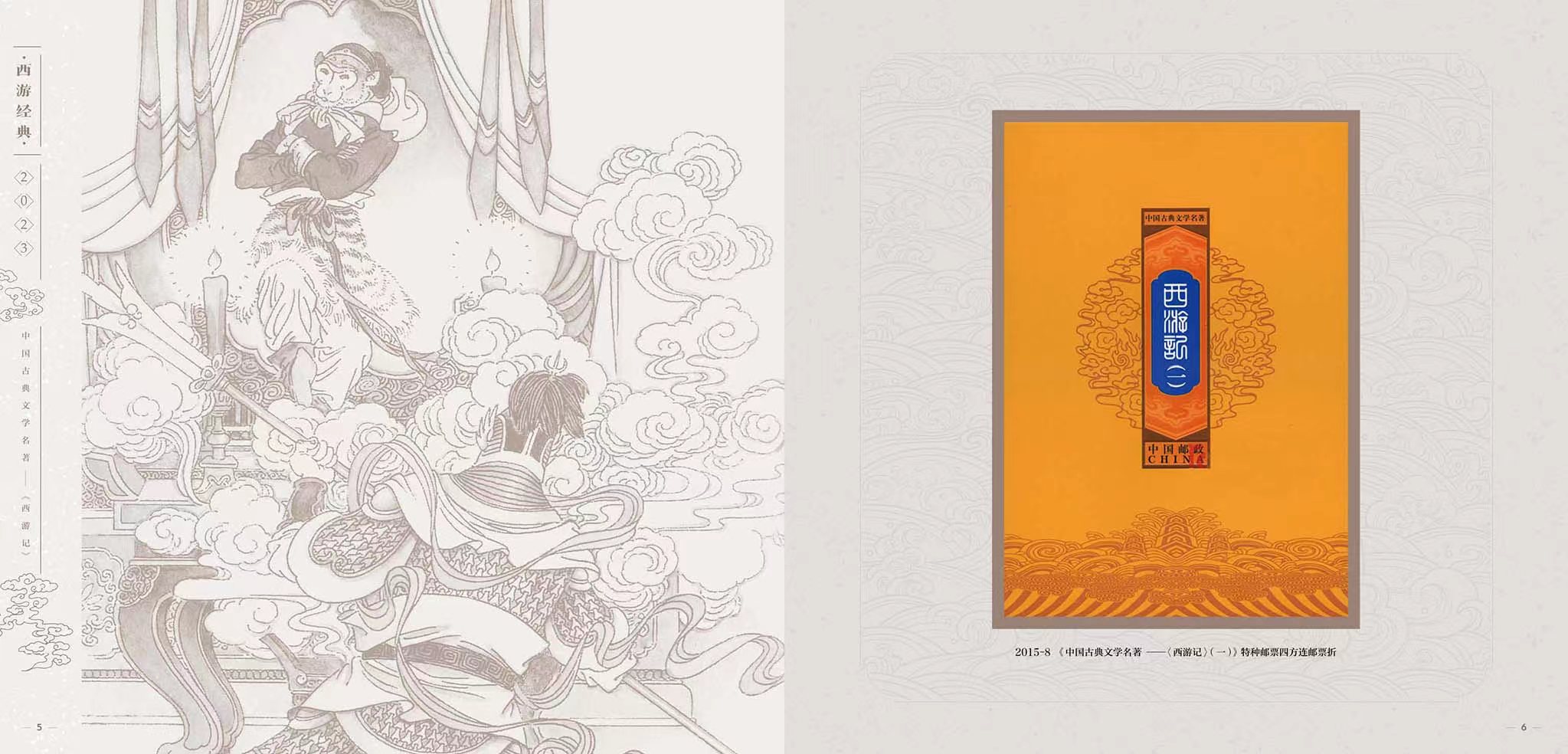 为弘扬经典,中国邮政从2015年开始发行“中国古典文学名著——《西游记》”邮票,截至2023年将发行至第五组,也是该系列的最后一组。邮票以传统工笔人物入画,借鉴连环画的表现形式,在形神兼备创作神话形象的同时,生动表现了大家熟知的故事情节。以方寸艺术再现了这部读者心中永远的经典。