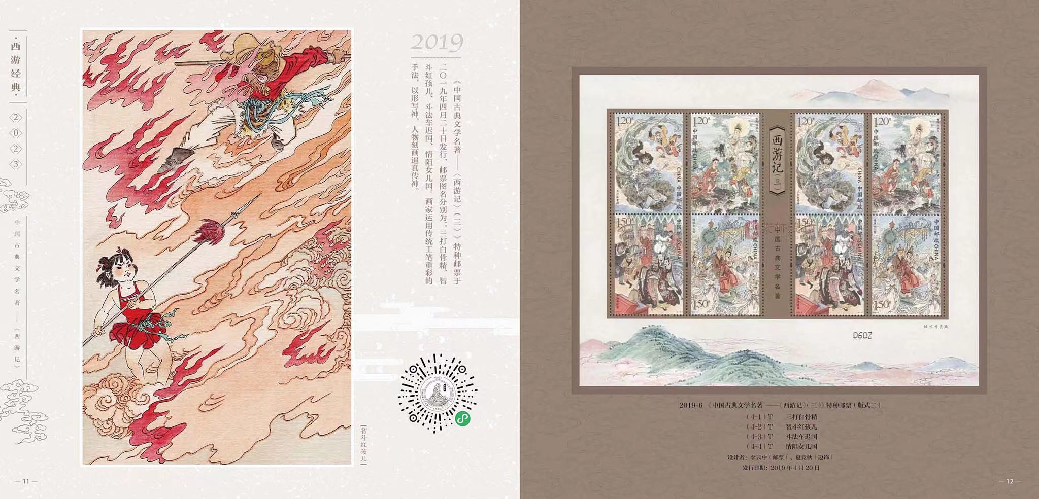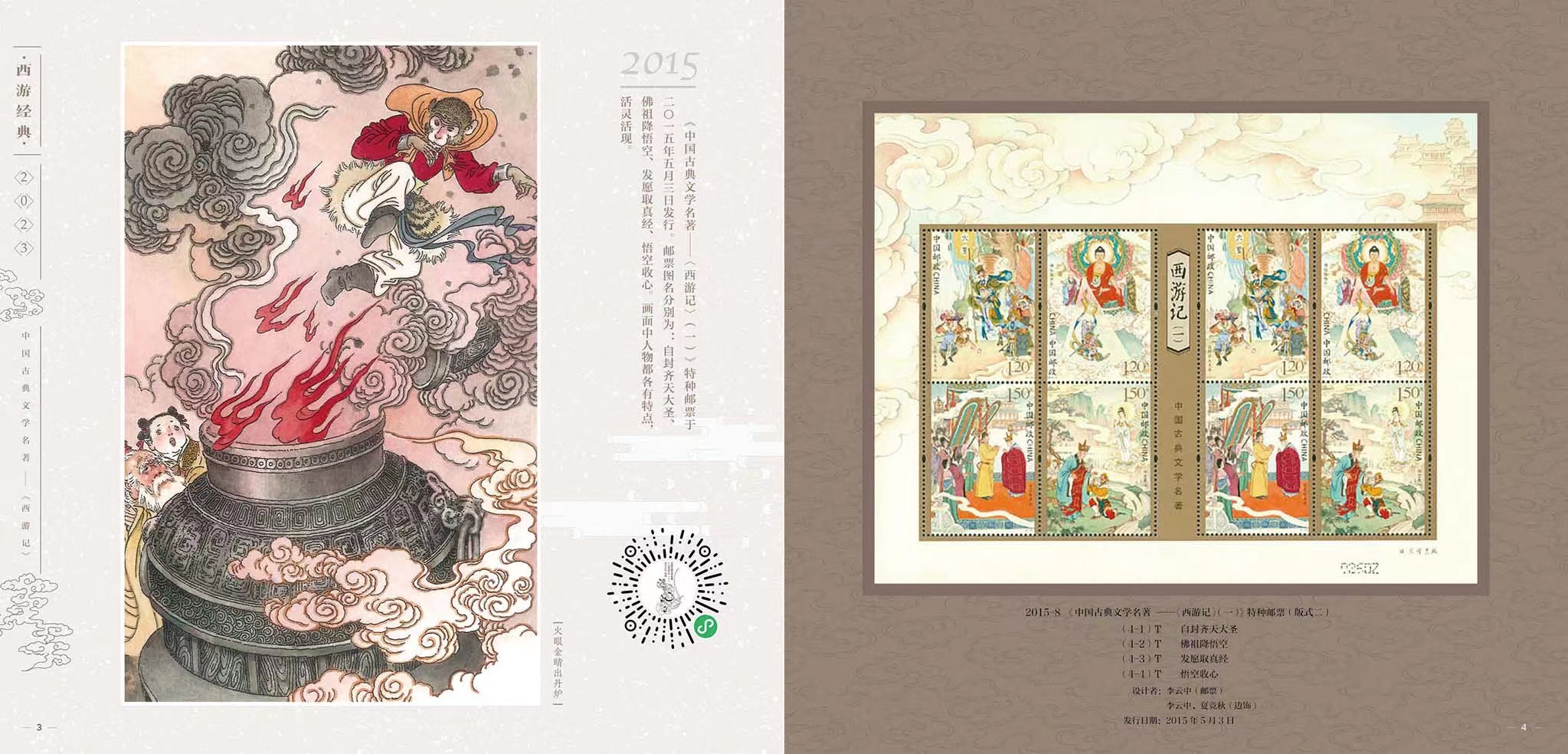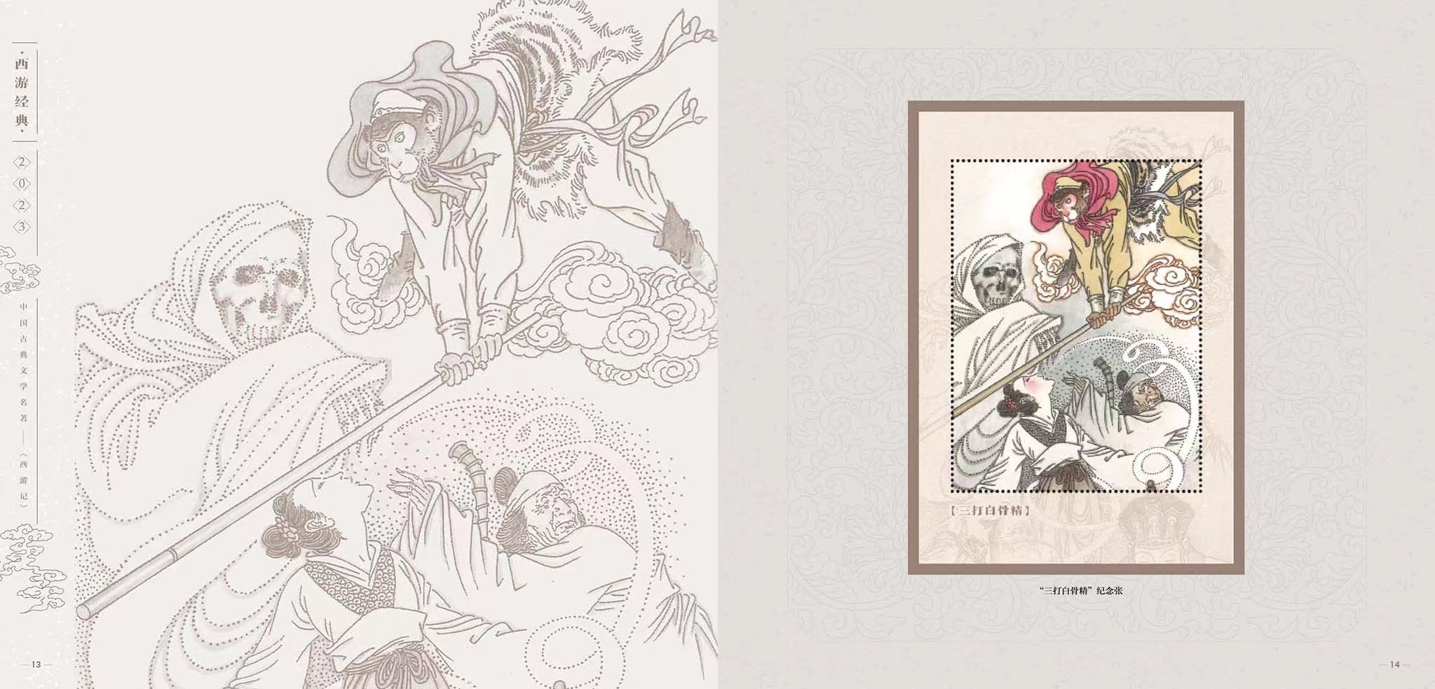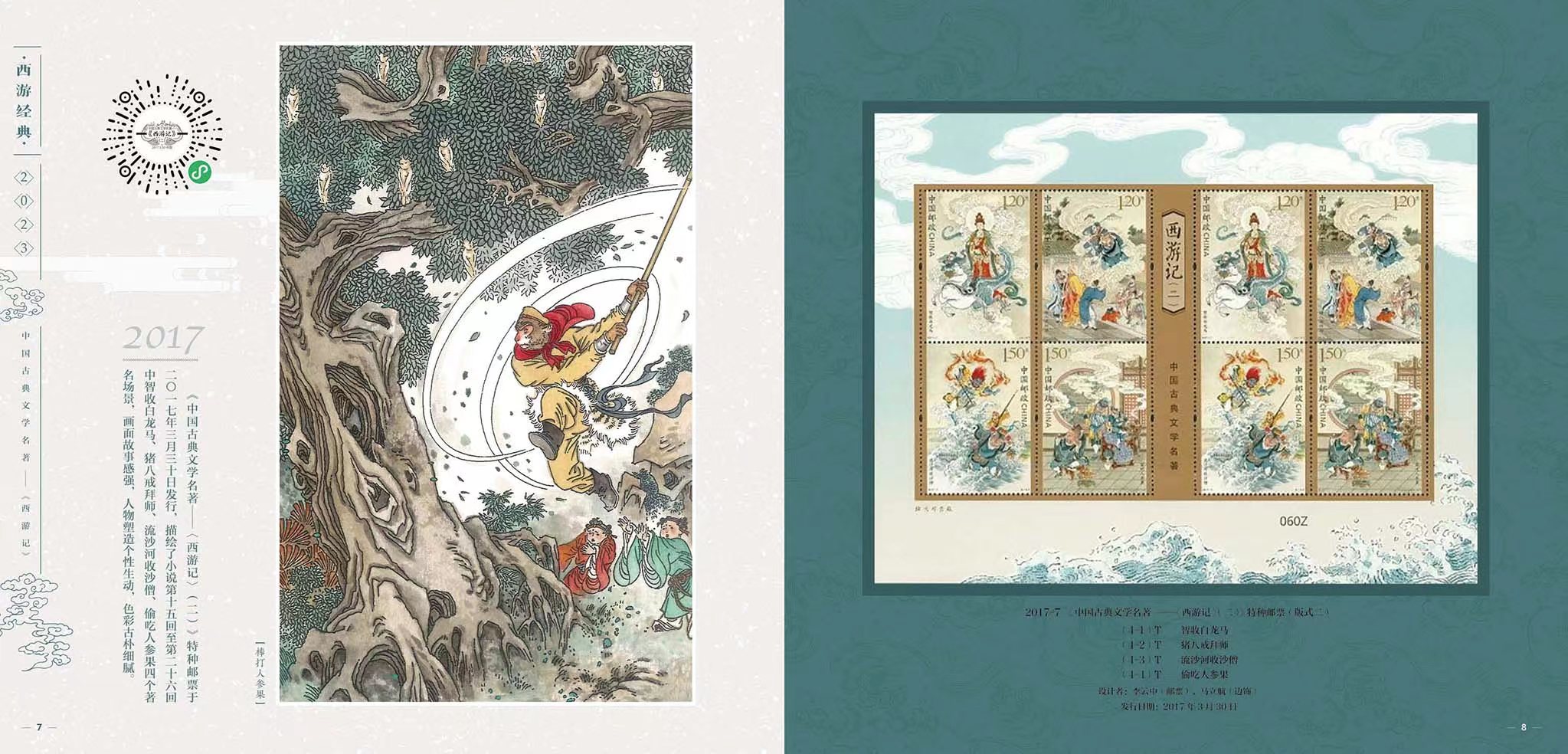 为弘扬经典,中国邮政从2015年开始发行“中国古典文学名著——《西游记》”邮票,截至2023年将发行至第五组,也是该系列的最后一组。邮票以传统工笔人物入画,借鉴连环画的表现形式,在形神兼备创作神话形象的同时,生动表现了大家熟知的故事情节。以方寸艺术再现了这部读者心中永远的经典。