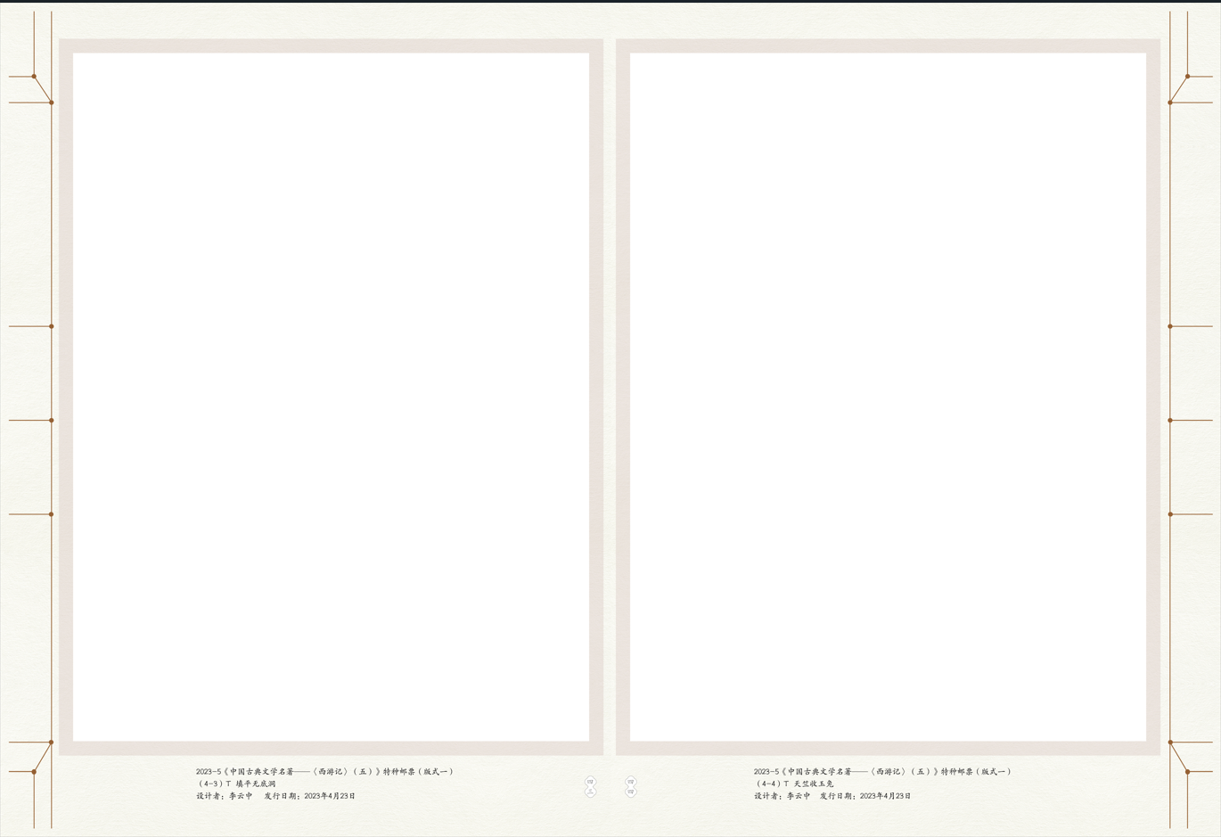 4、整体邮品设计传统古朴、简洁洗练,封面“邮览”两字大气磅礴。通过国图古籍插图+珍稀题材+魅力新邮的组合,将四大名著的新老票汇为一册,相映成趣,在传达邮票文化内涵与传统文化美学品味之间,有独到的思路与手法。