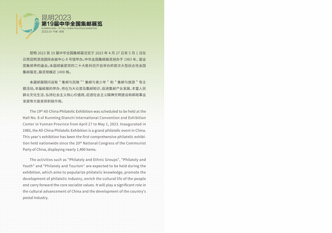 中国集邮有限公司于2023年4月27日发行《昆明2023第19届中华全国集邮展览》集邮护照,该产品邮票页为1枚版“贺”主图个性化邮票特殊版式印制,为集邮爱好者收集各省邮戳提供载体。同时购买集邮护照的用户,通过邮票百科扫描护照的二维码可领取隐藏电子纪念邮戳,凭截图在邮展现场总公司展厅可加盖隐藏版实物纪念邮戳1枚。
