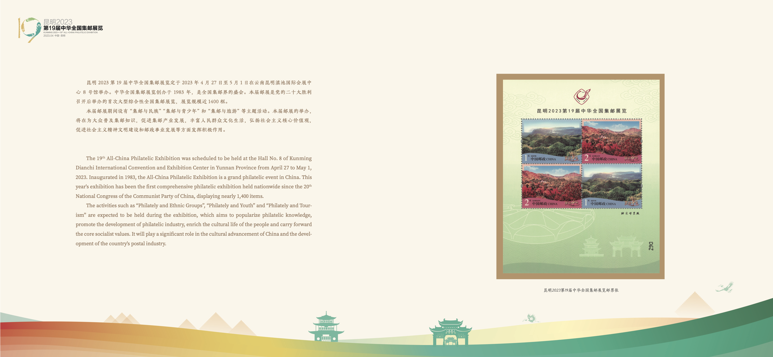 中国集邮有限公司于2023年4月27日发行《昆明2023第19届中华全国集邮展览》主题日纪念专题册。