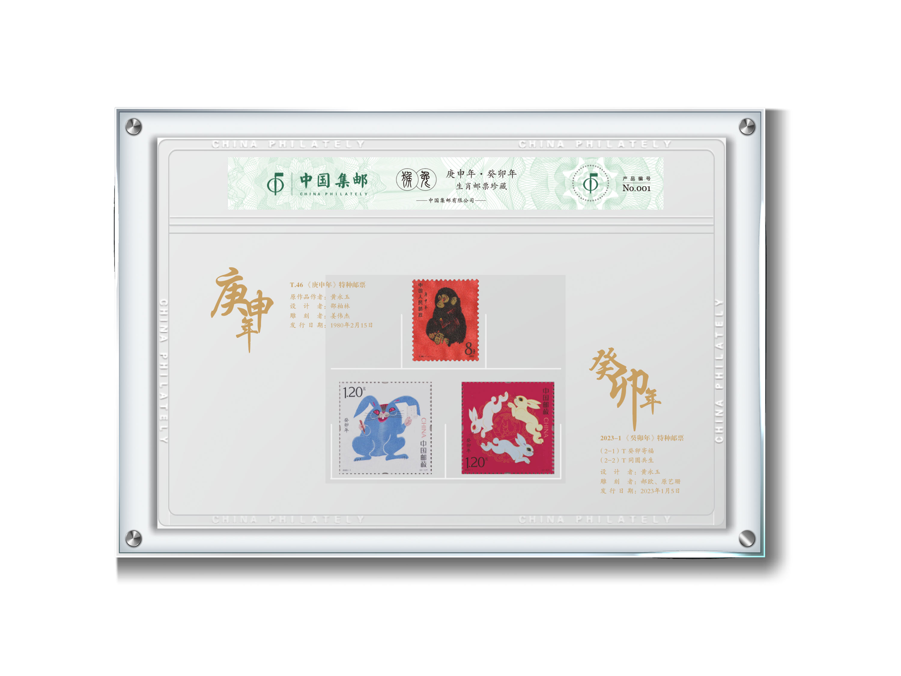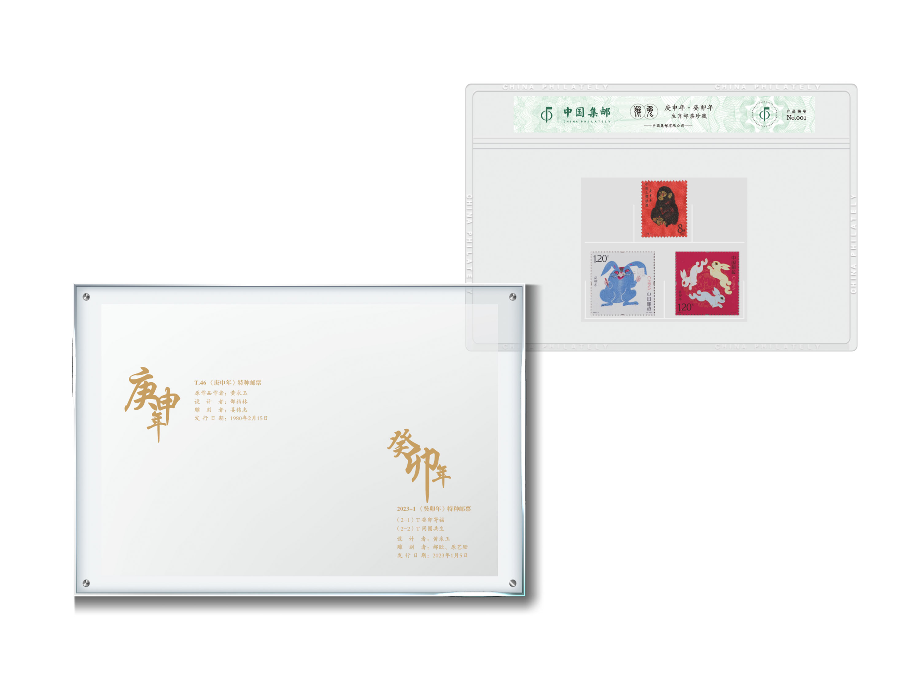 产品配中国集邮有限公司的防伪封装标签,赋产品编号,并带有邮票技术资料,具有纪念收藏价值。同时还可将封装片放入专门设计的带有书法装饰元素的亚克力相框中,成为一个精美摆件。外包装整体红色,简洁大方,醒目的“庚申癸卯”汉字与“1980”“2023”等元素,充分体现了本产品的邮票主题与文化内涵。