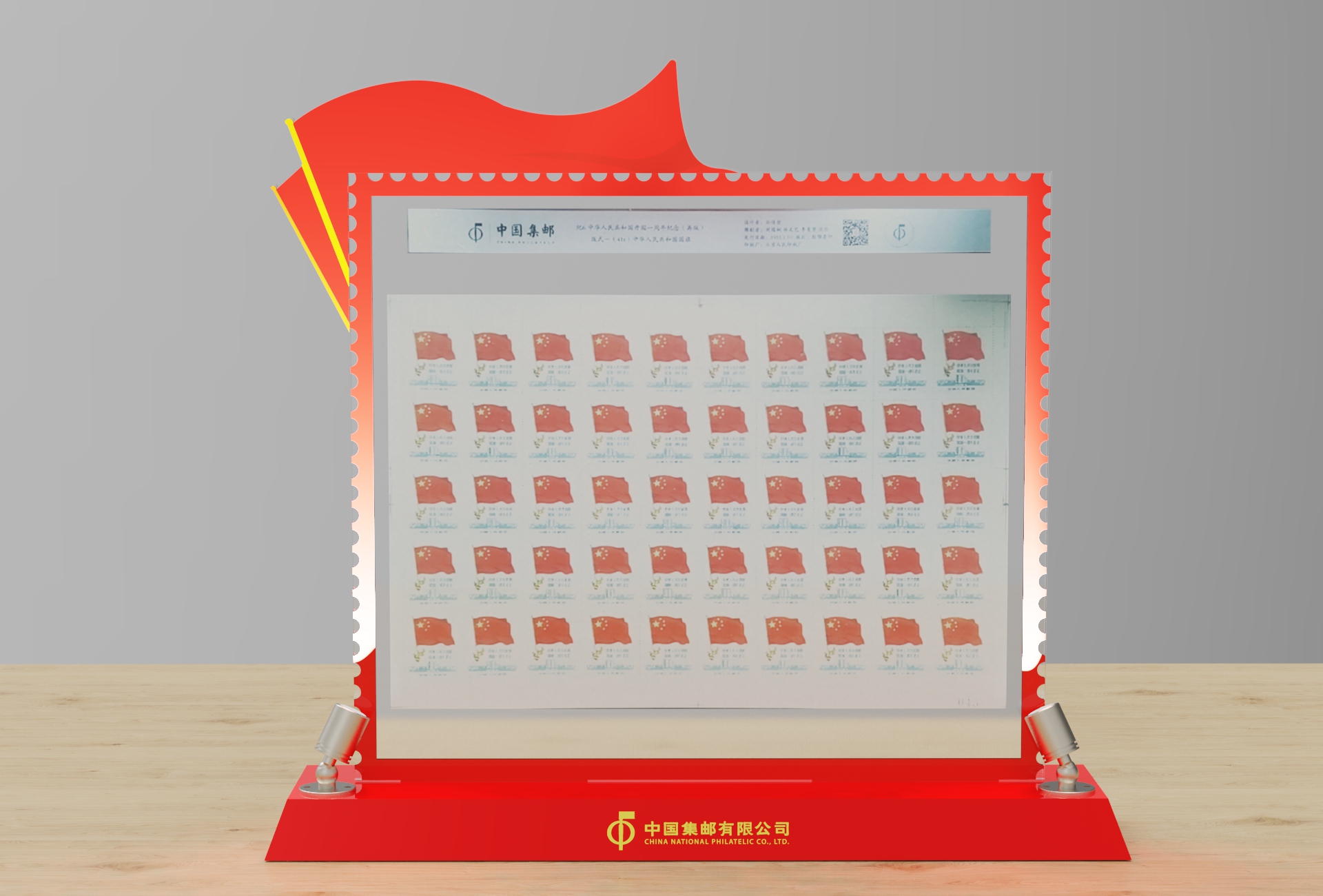 纪6《中华人民共和国开国一周年纪念》(5-5)(再版)版式一邮票,配以“红旗”外形亚克力摆台,代表了国家朝气蓬勃、顽强的生命力和无限的希望。 邮折一版,内含2004-23 《中华人民共和国国旗国徽》特种邮票 (2-1)国旗 版式一,与纪6(5-5)图案相呼应。