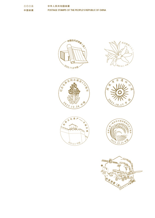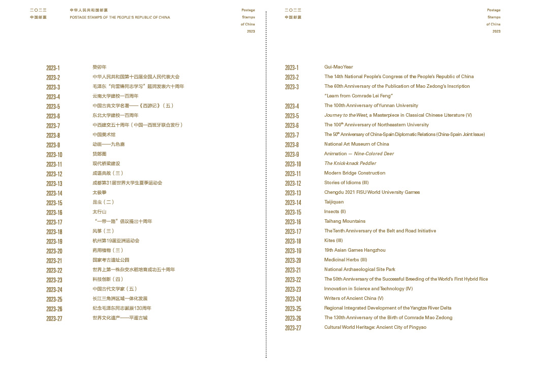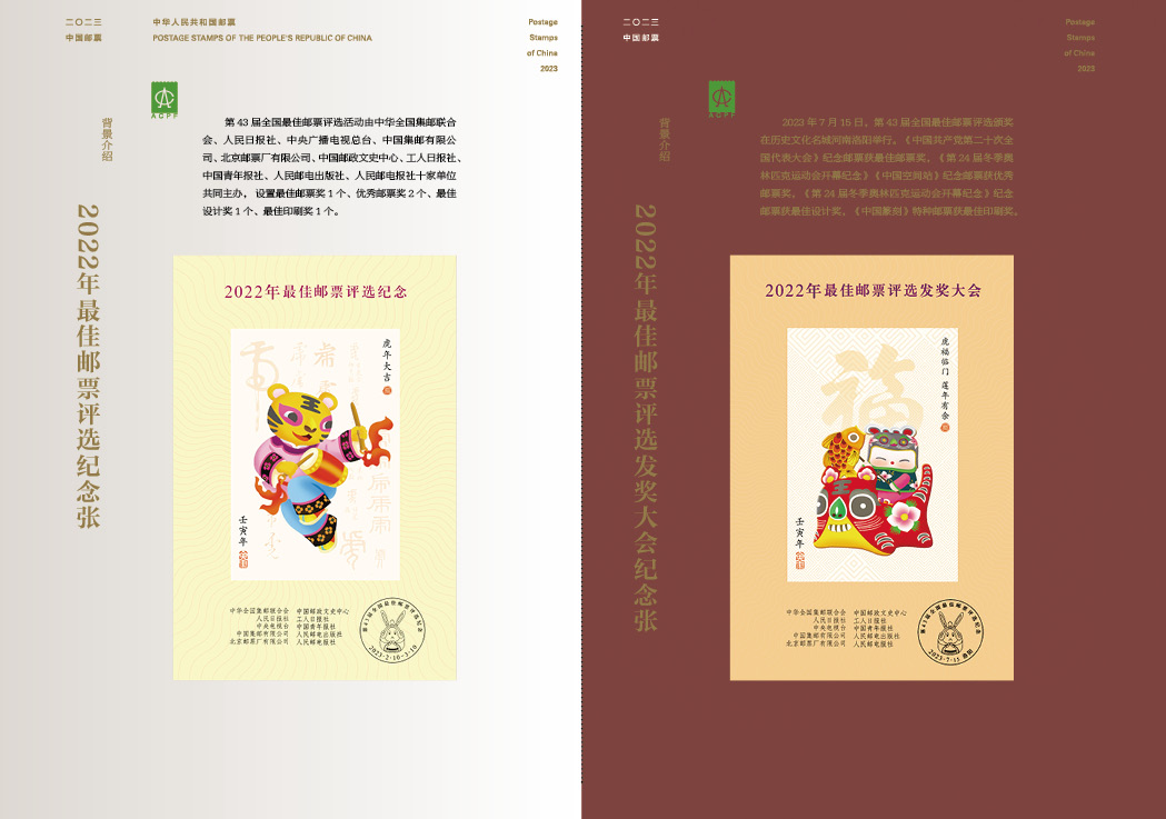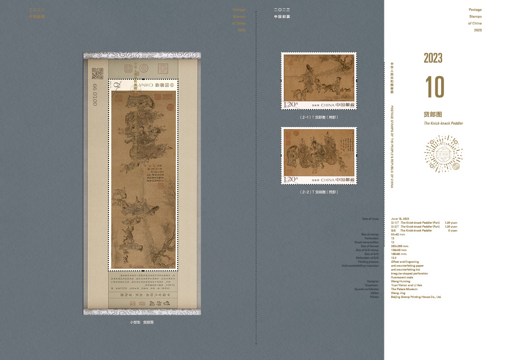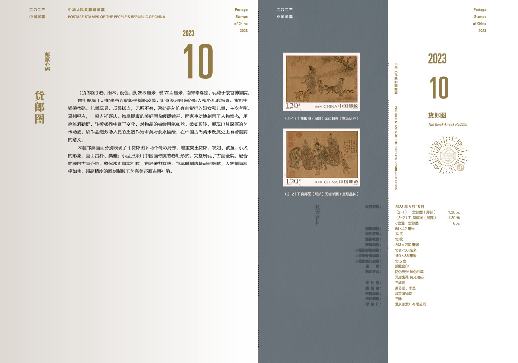 包含2023年纪特邮票(含小型张、小全张),2022年佳邮评选纪念张,《货郎图》无齿邮票页。