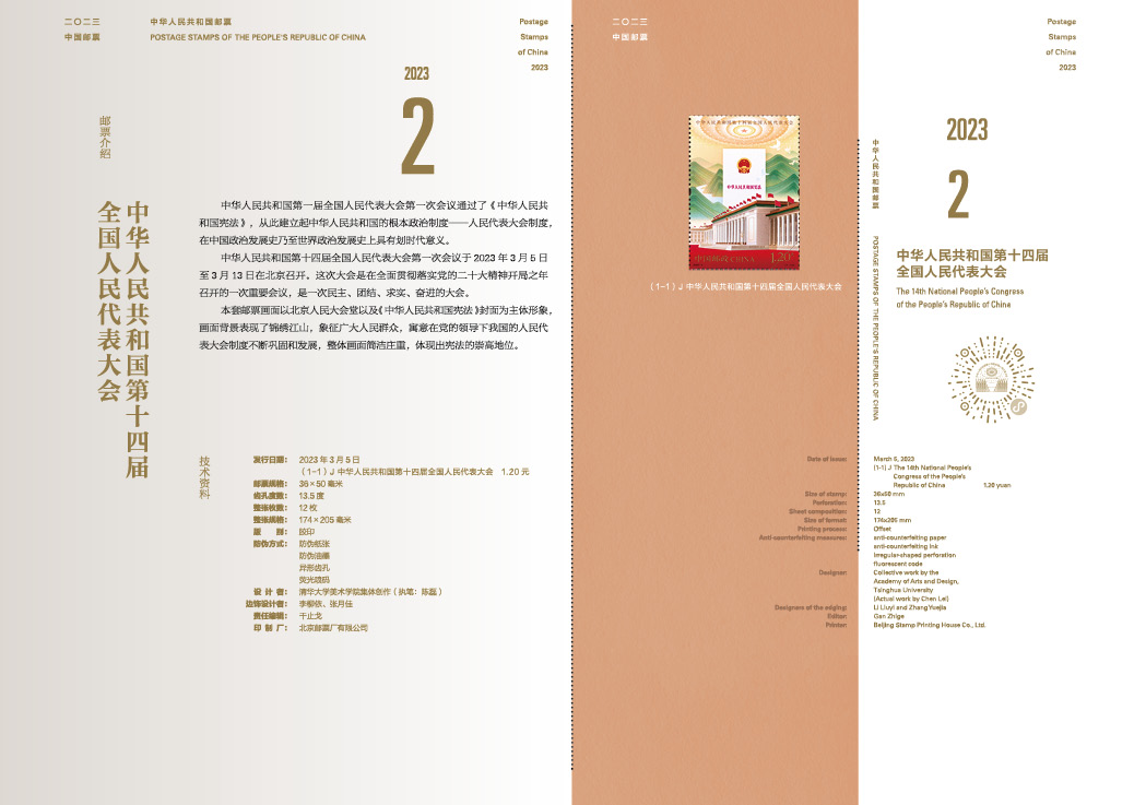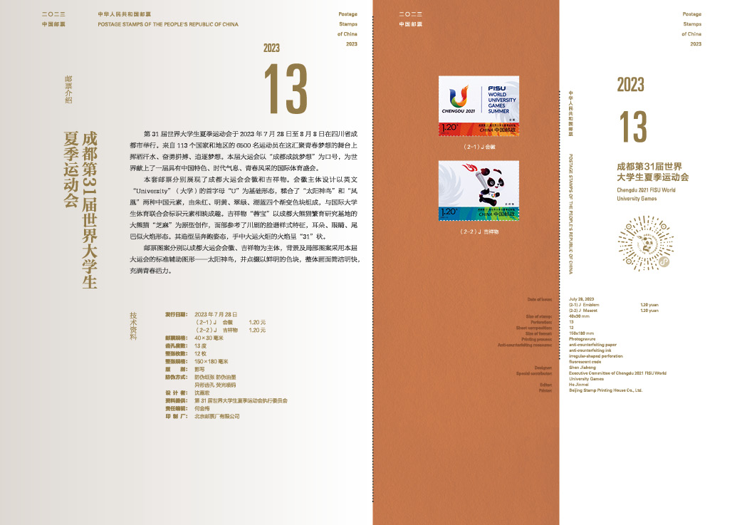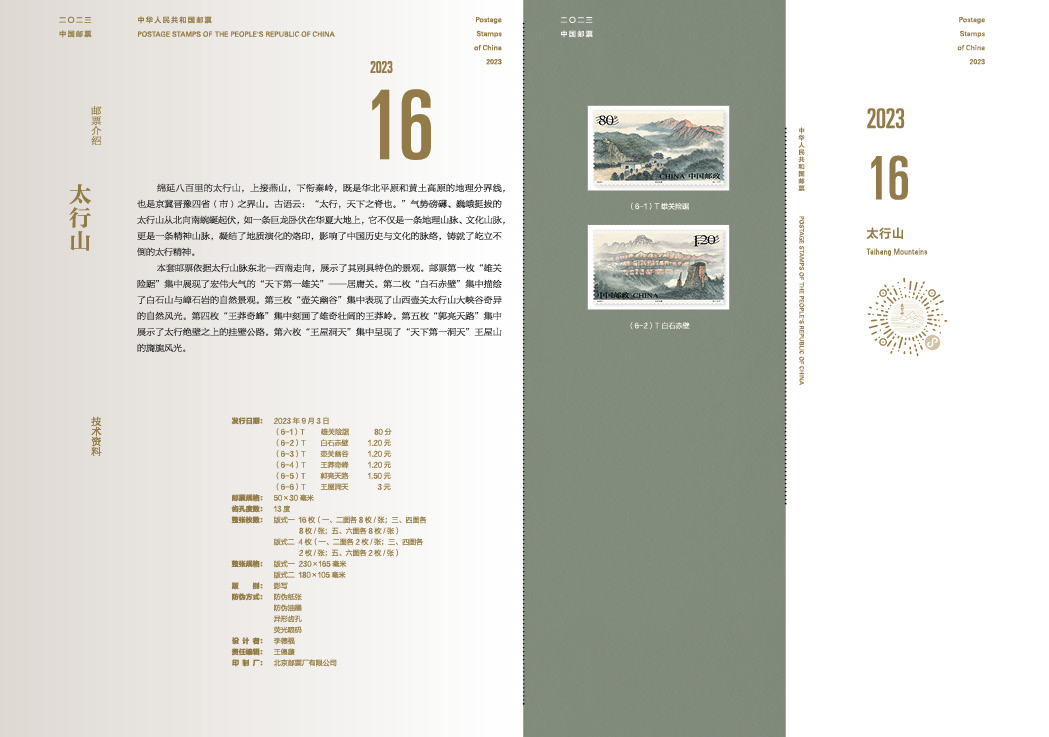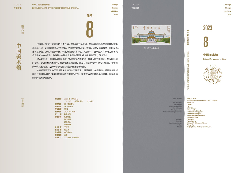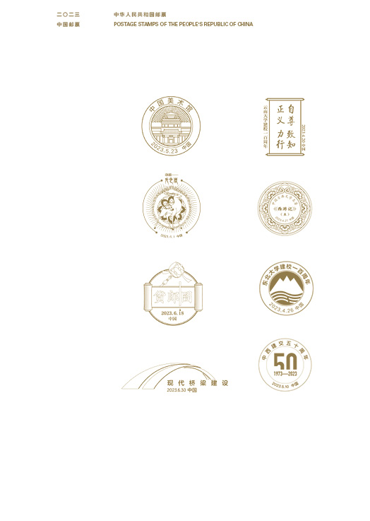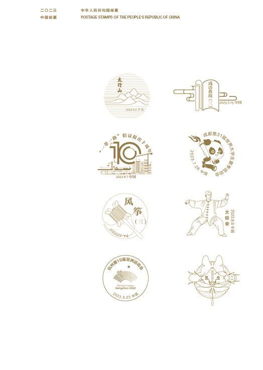封面以年份“2023”构成纹理,烫金工艺恰当地突出了主题,并与内页的暖色调和谐呼应。内页选用莫兰迪色调和印金字体对邮票进行衬托,一页一版式,并配有详实的邮票介绍及相关技术资料,拓展了邮票的文化内涵,同时汇集全年邮票的首日戳图案,“邮味儿”十足。