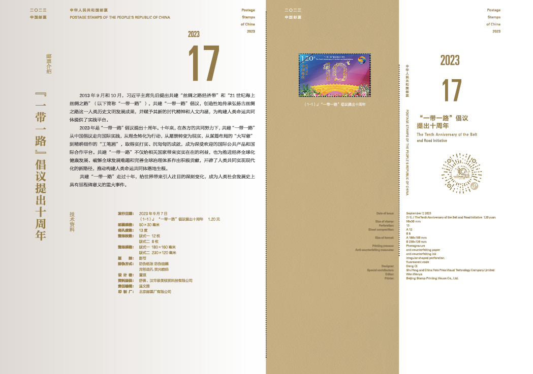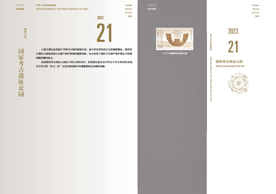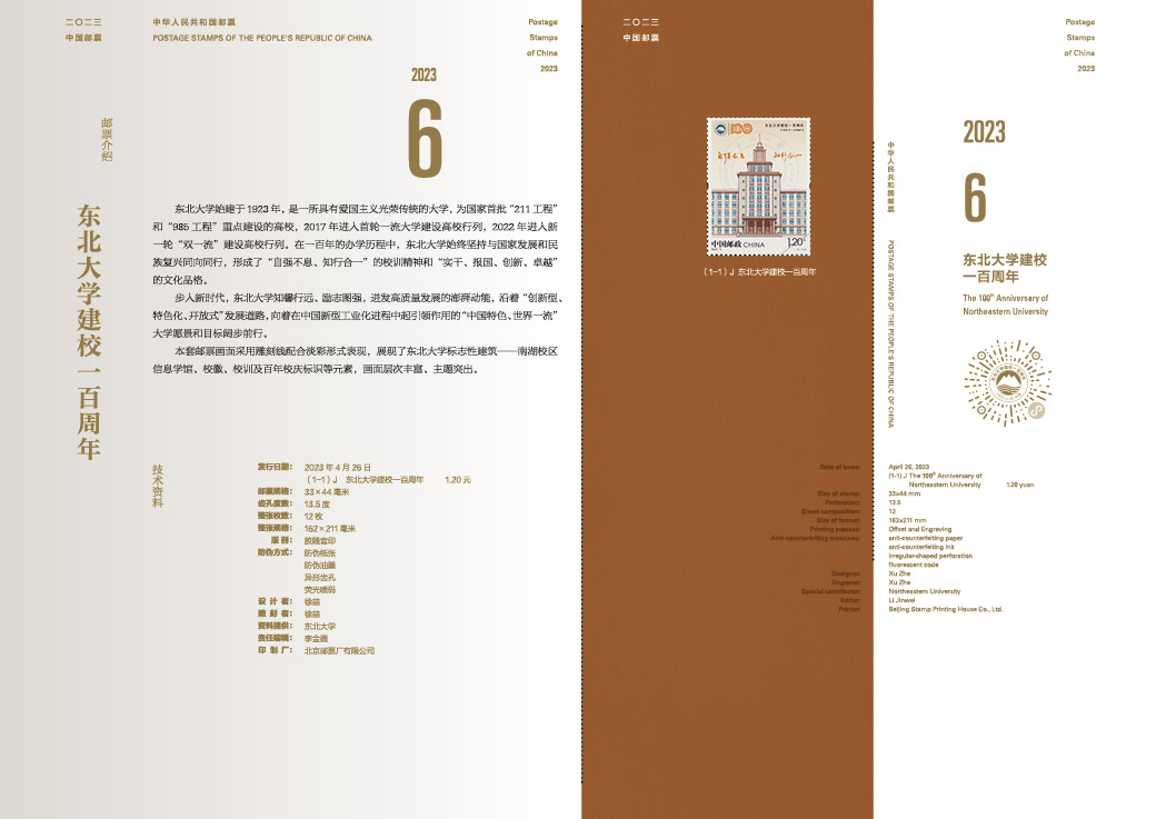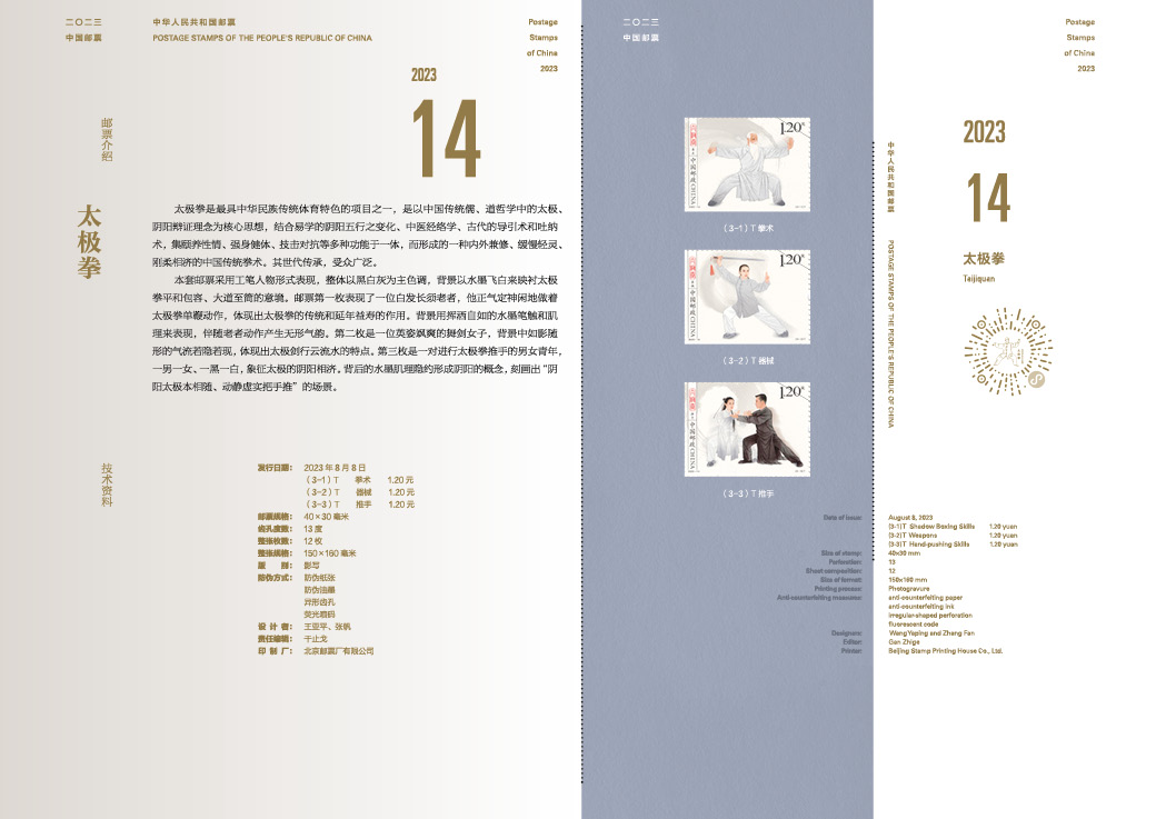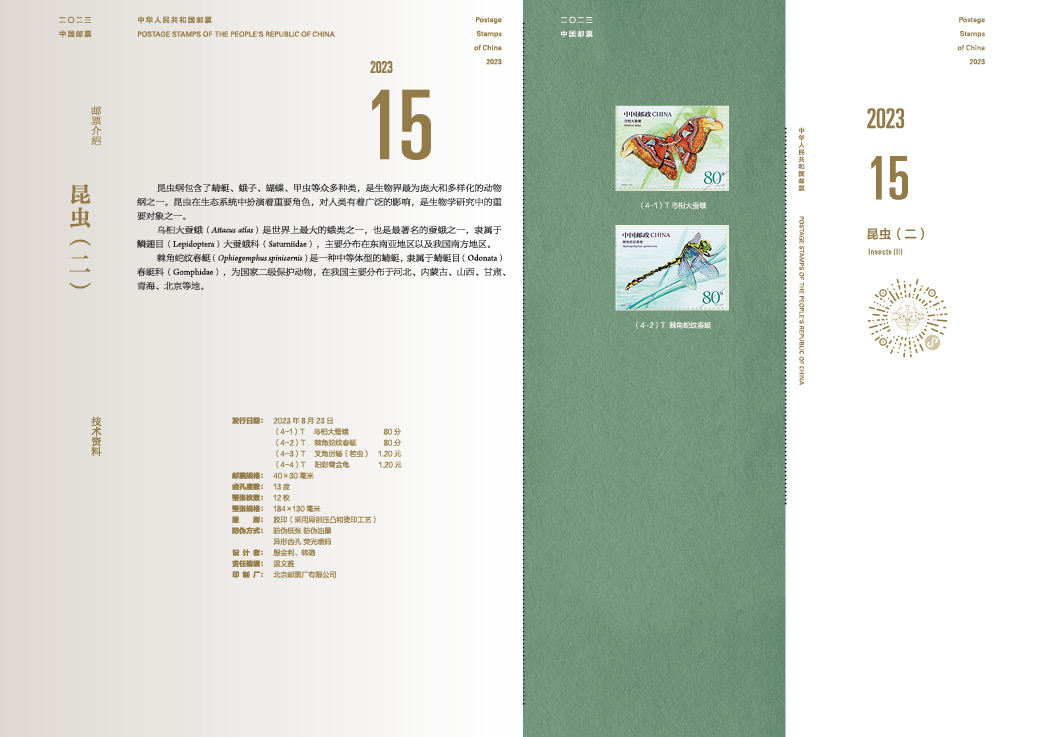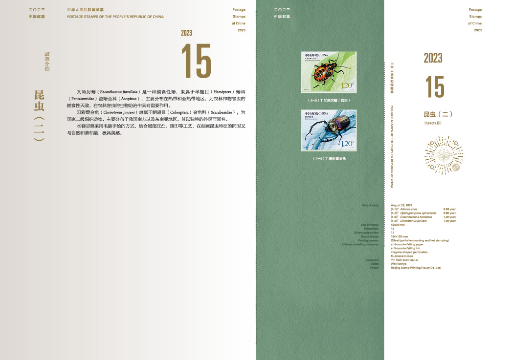 封面以年份“2023”构成纹理,烫金工艺恰当地突出了主题,并与内页的暖色调和谐呼应。内页选用莫兰迪色调和印金字体对邮票进行衬托,一页一版式,并配有详实的邮票介绍及相关技术资料,拓展了邮票的文化内涵,同时汇集全年邮票的首日戳图案,“邮味儿”十足。