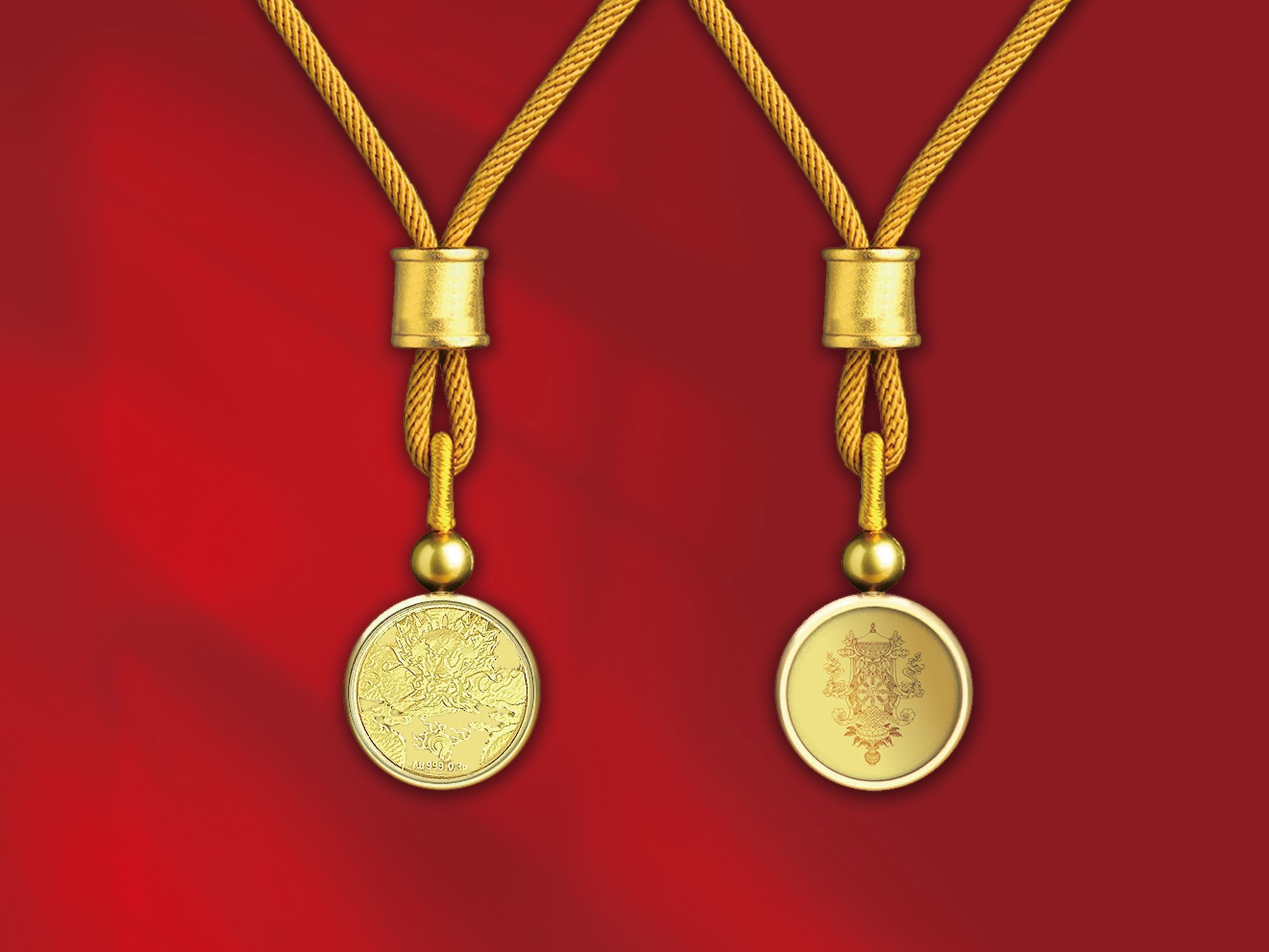 龙行第二运——“福寿绵长”盘龙挂,采用0.3克Au999精工铸造,造型立体饱满,大气精致,佩戴盘龙挂既彰显身份,又能护佑平安健康。
