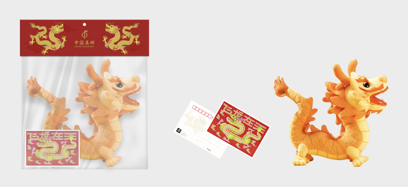 集邮文创系列产品,编号“集邮玩偶-2”。 毛绒玩偶形象以《甲辰年》邮票2-1中的⻰形象为原型设计, 产品内放《飞龙在天》明信片(贴《龙腾贺岁》贺年专用邮票)一枚。