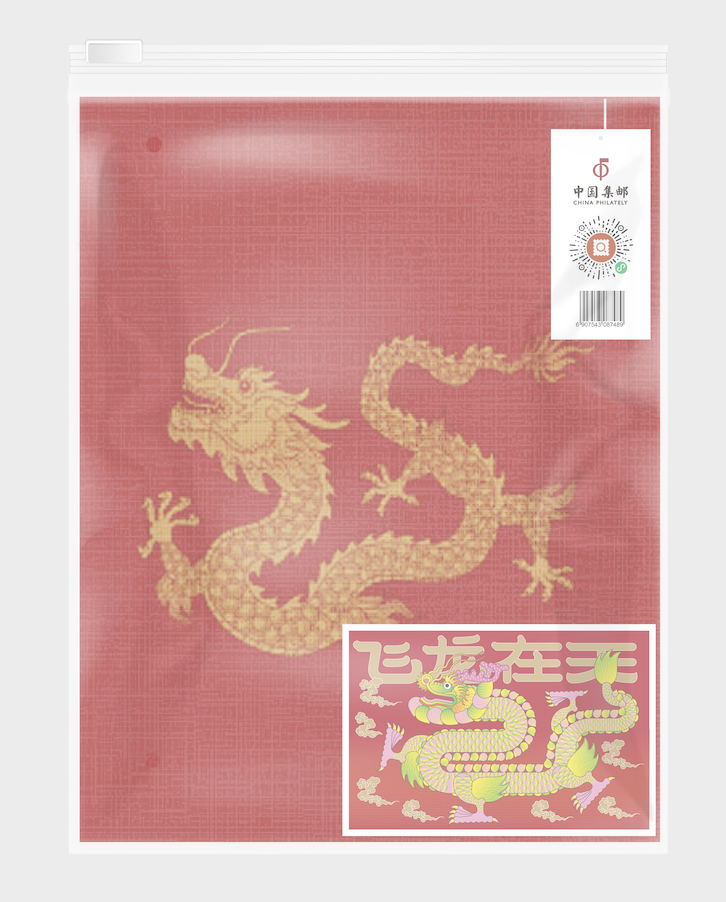 集邮文创系列产品。 围巾图案仿印《甲辰年》邮票2-1图,产品内放《飞龙在天》明信片(贴《龙腾贺岁》贺年专用邮票)一枚。